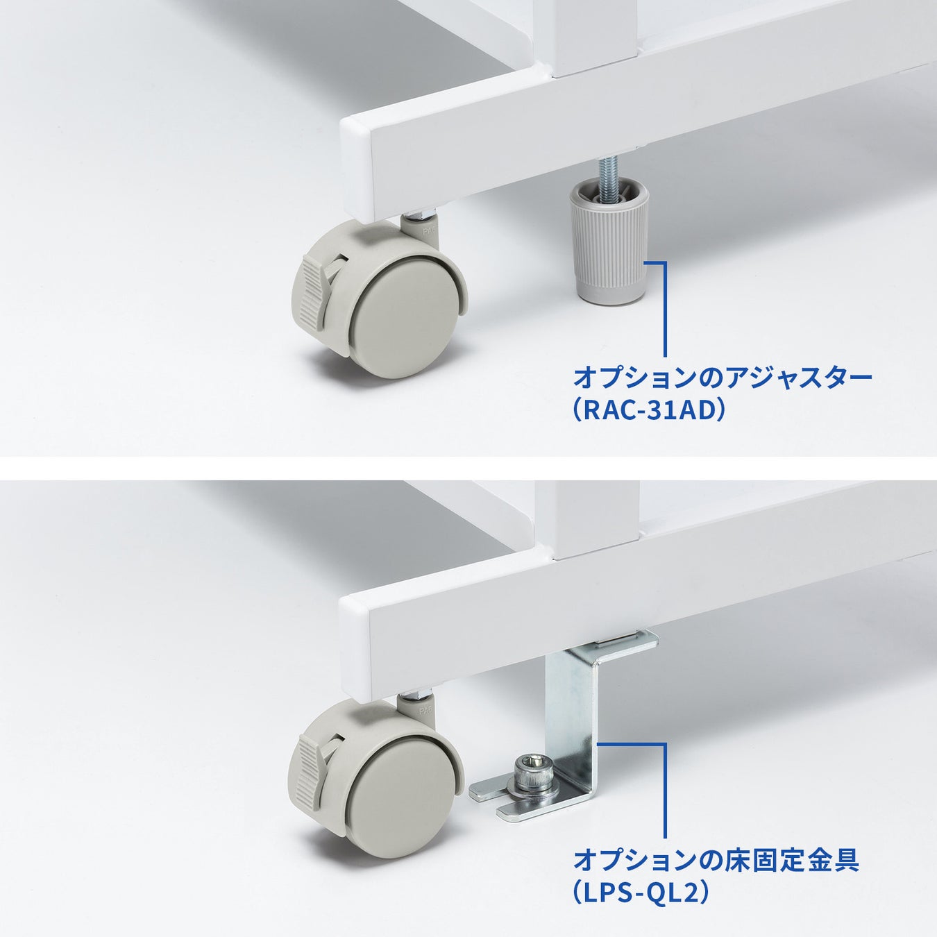 オプションで高さを微調整でき、ガタツキを防止できるアジャスター「RAC-31AD」、スタンドを床に固定する床固定金具「LPS-QL2」が取り付け可能です。