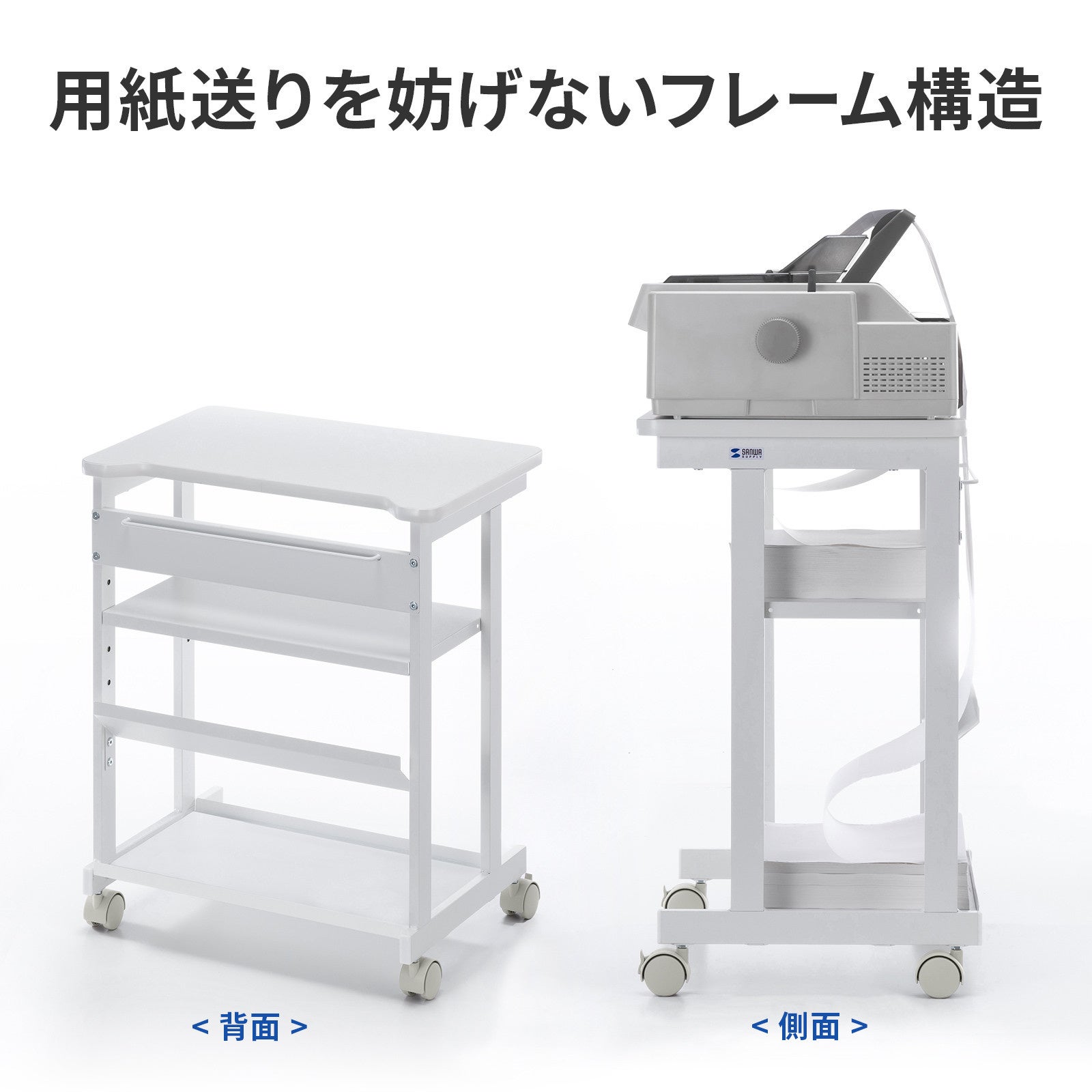 天板は紙送りがしやすい切り欠き形状になっており、紙送りがスムーズに行えるため、伝票など連続用紙を使用するドットプリンタに最適です。背面はフレーム構造になっているため、用紙の送りを妨げるものがほとんどありません。