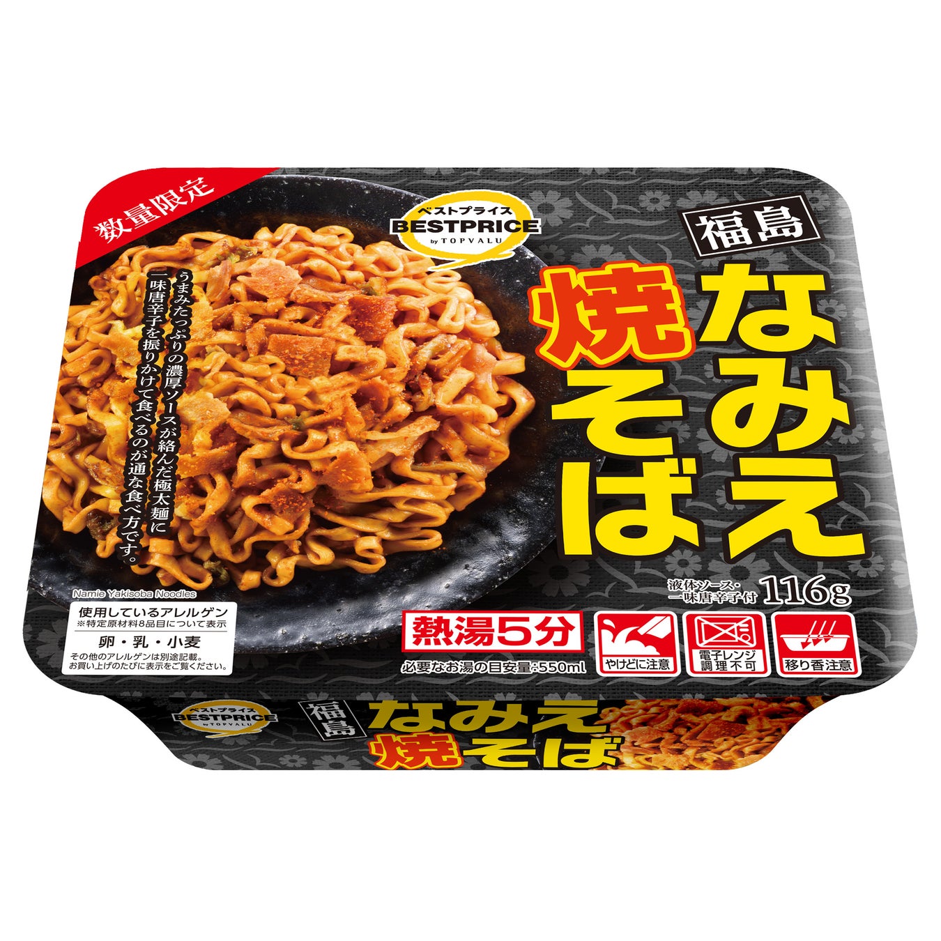 このたび発売する「トップバリュベストプライス 福島なみえ焼そば」は、福島県双葉郡浪江町で働く方々のために食べ応えと満足感をよくするために約50年前に考案されたご当地グルメ「なみえ焼そば」を手軽に味わっていただける商品です。浪江町商工会が推奨する、地元メーカー「旭屋」の「なみえ焼そばオリジナル濃厚ソース」を絡めた極太麺に、一味唐辛子のアクセントがあとを引くおいしさです。