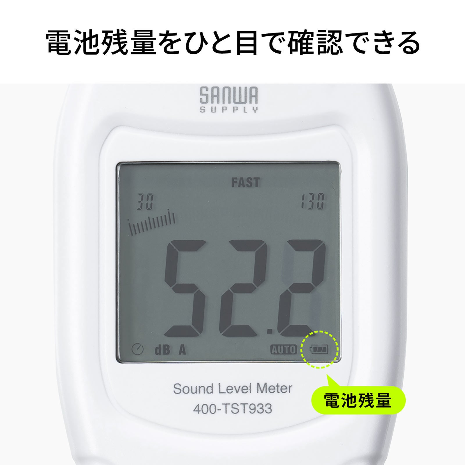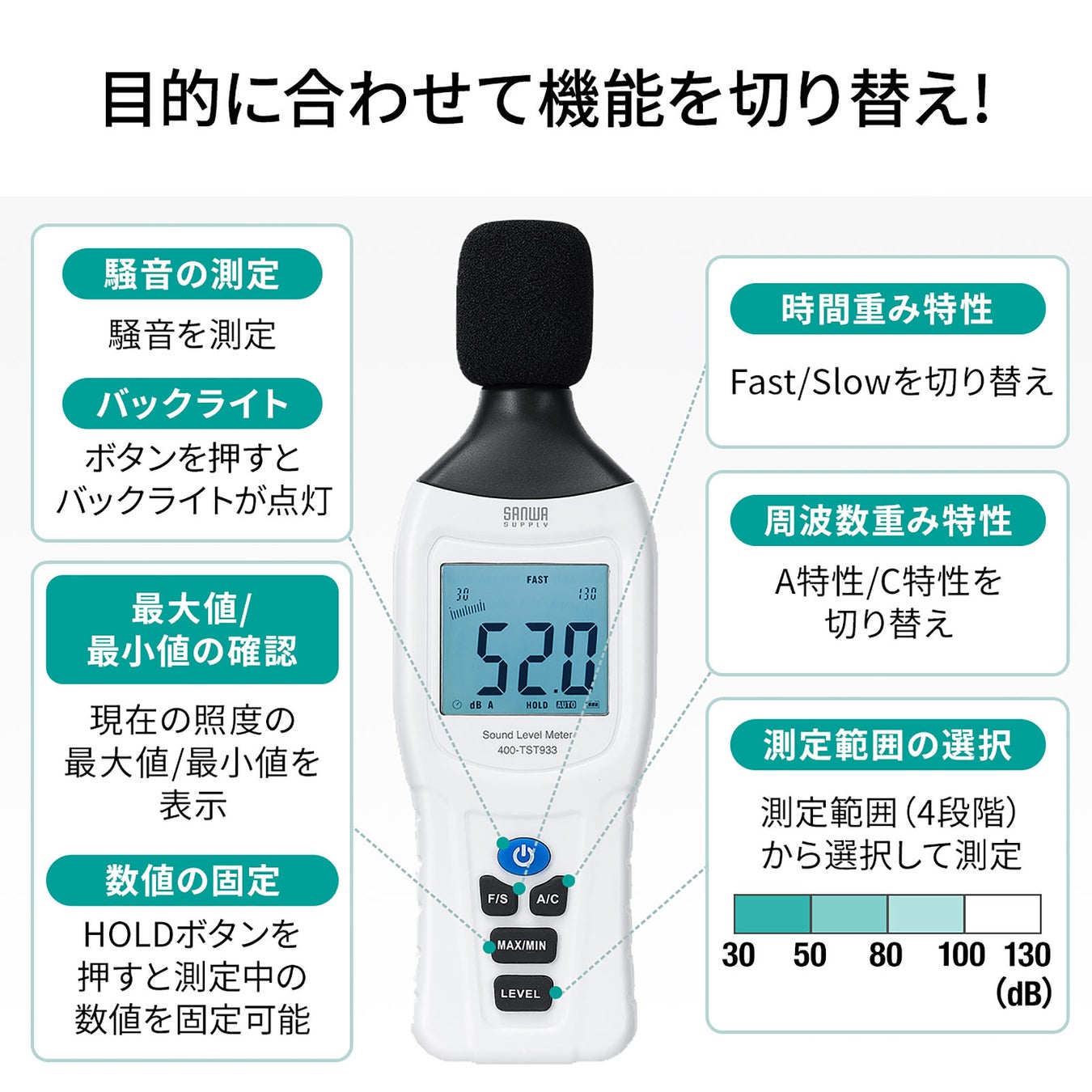 本製品は、簡単に操作でき、デジタル表示とアナログバー表示可能な騒音測定器です。周波数特性 A特性(dBA)、C特性(dBC)の測定が可能です。事務所、図書館、病院、体育館、住居などの屋内から、道路やグランドなどの屋外まで使用できます。測定した値を固定表示可能なホールド機能が付いています。