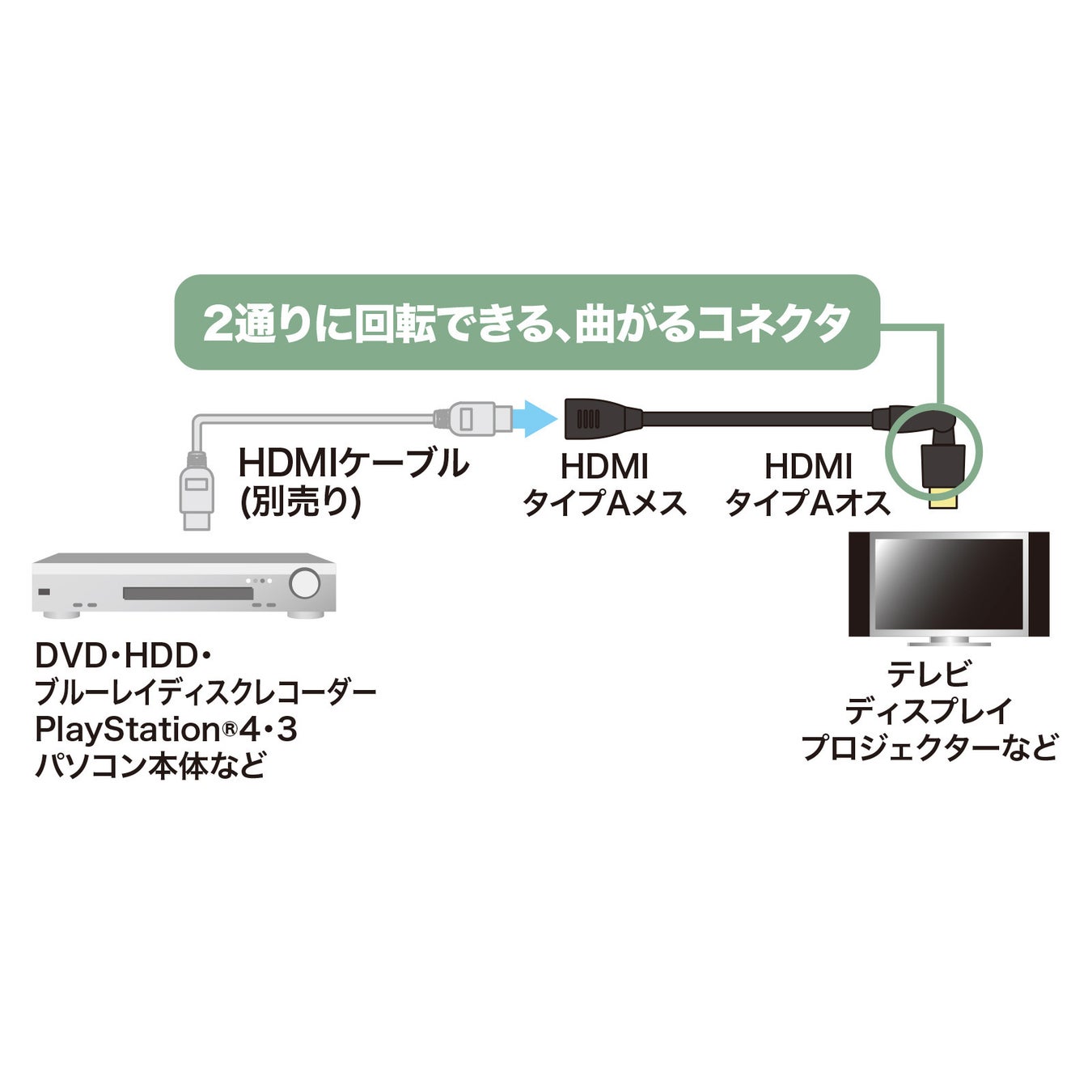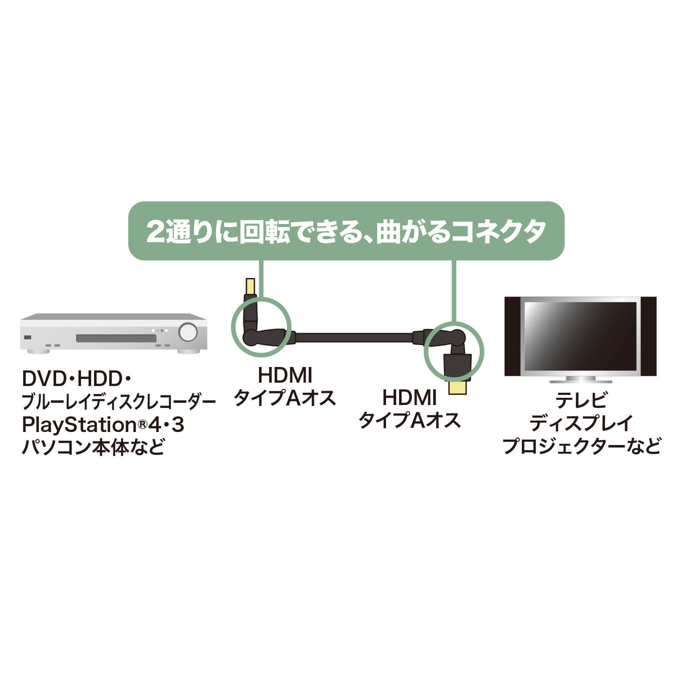DVD・ハイビジョン・ブルーレイディスクレコーダー・パソコン本体などとハイビジョンテレビ・液晶ディスプレイ・プロジェクターなどの機器を接続します。映像と音声とネットワークの信号を1本のケーブルで伝送できます。また、本製品はコネクタ部分が90度に折れ曲がり、さらに回転するので、モニタの壁面取り付けなどの狭い隙間の配線に便利です。