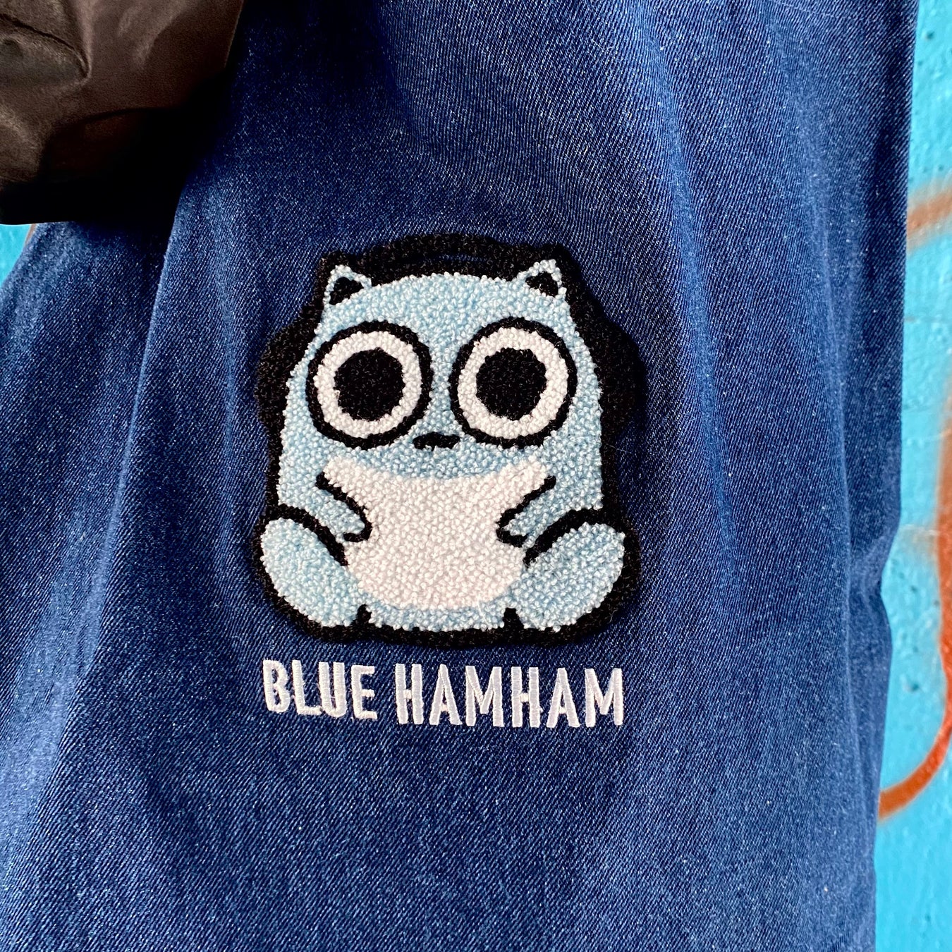 デニム素材でサガラ刺繍のブルーハムハムがデザインされたトートバッグです。