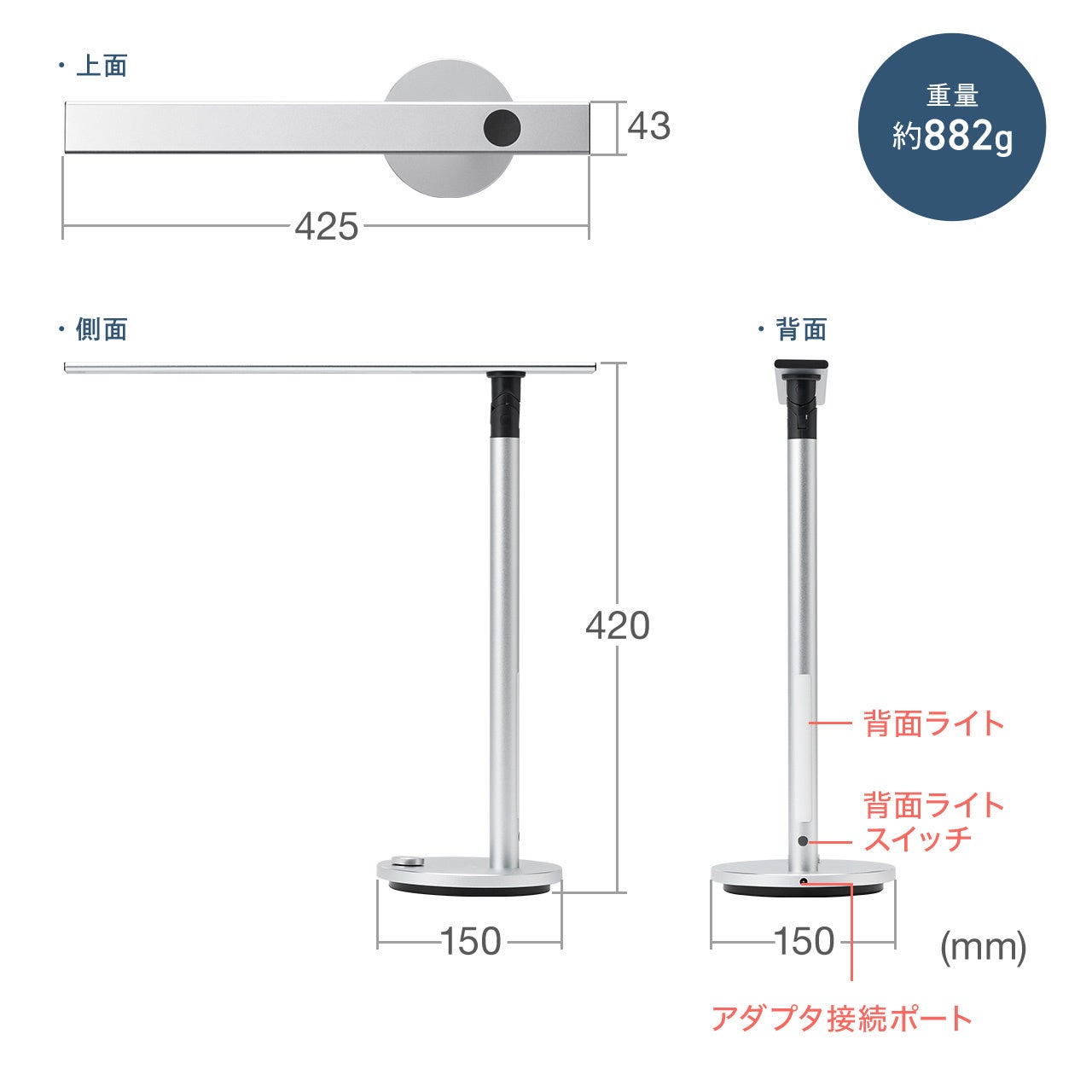 本製品のサイズは約W420×D425×H150mm、 重量は約882gです。
