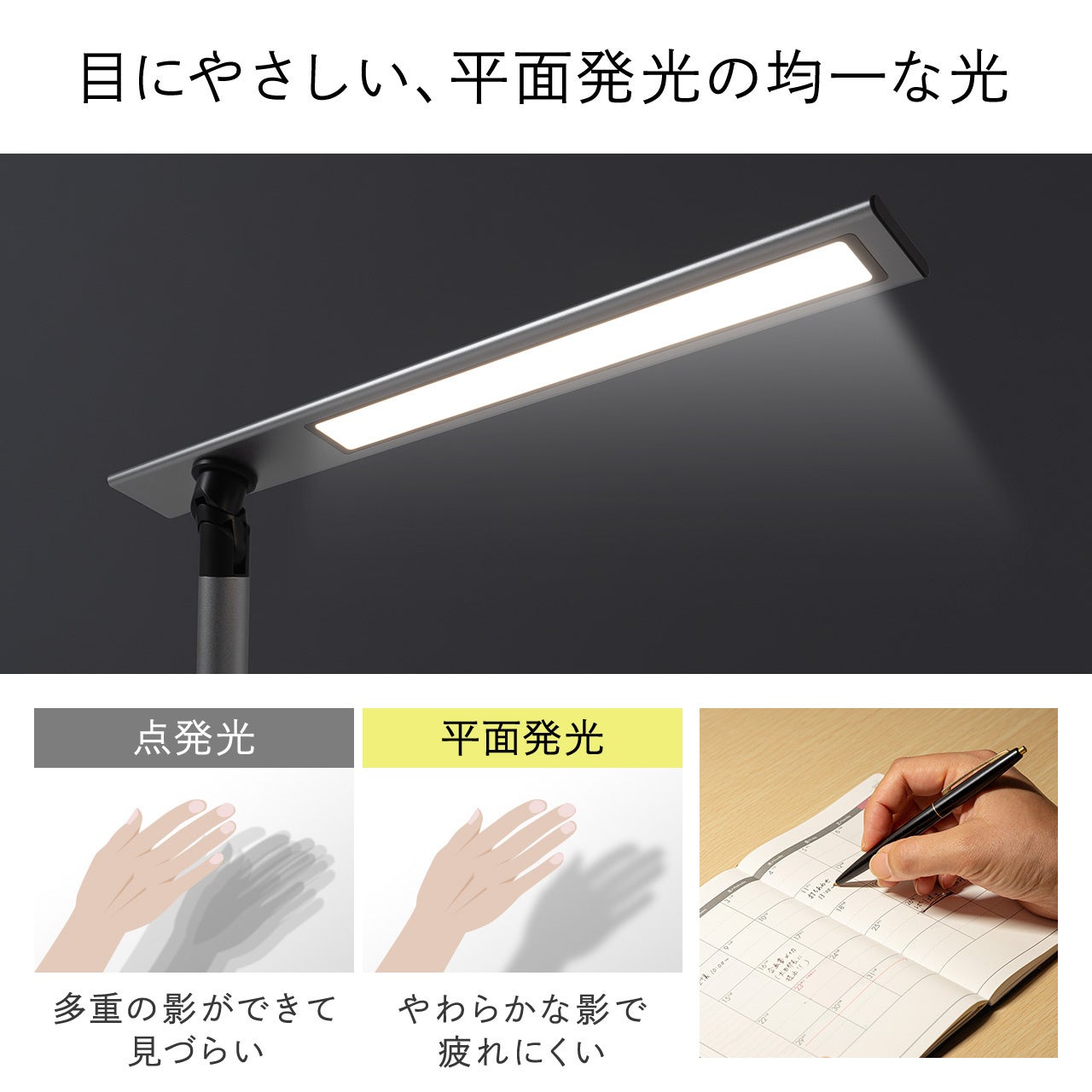 面発光で均一に照らし、まぶしくありません。
