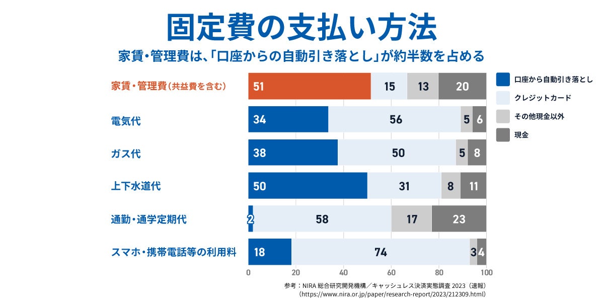 キャッシュレス決済の普及について調べた公益財団法人NIRA総合研究開発機構の調査(※2)では、家賃・管理費の支払いにおいては、約51%が口座振替であることがわかっています。