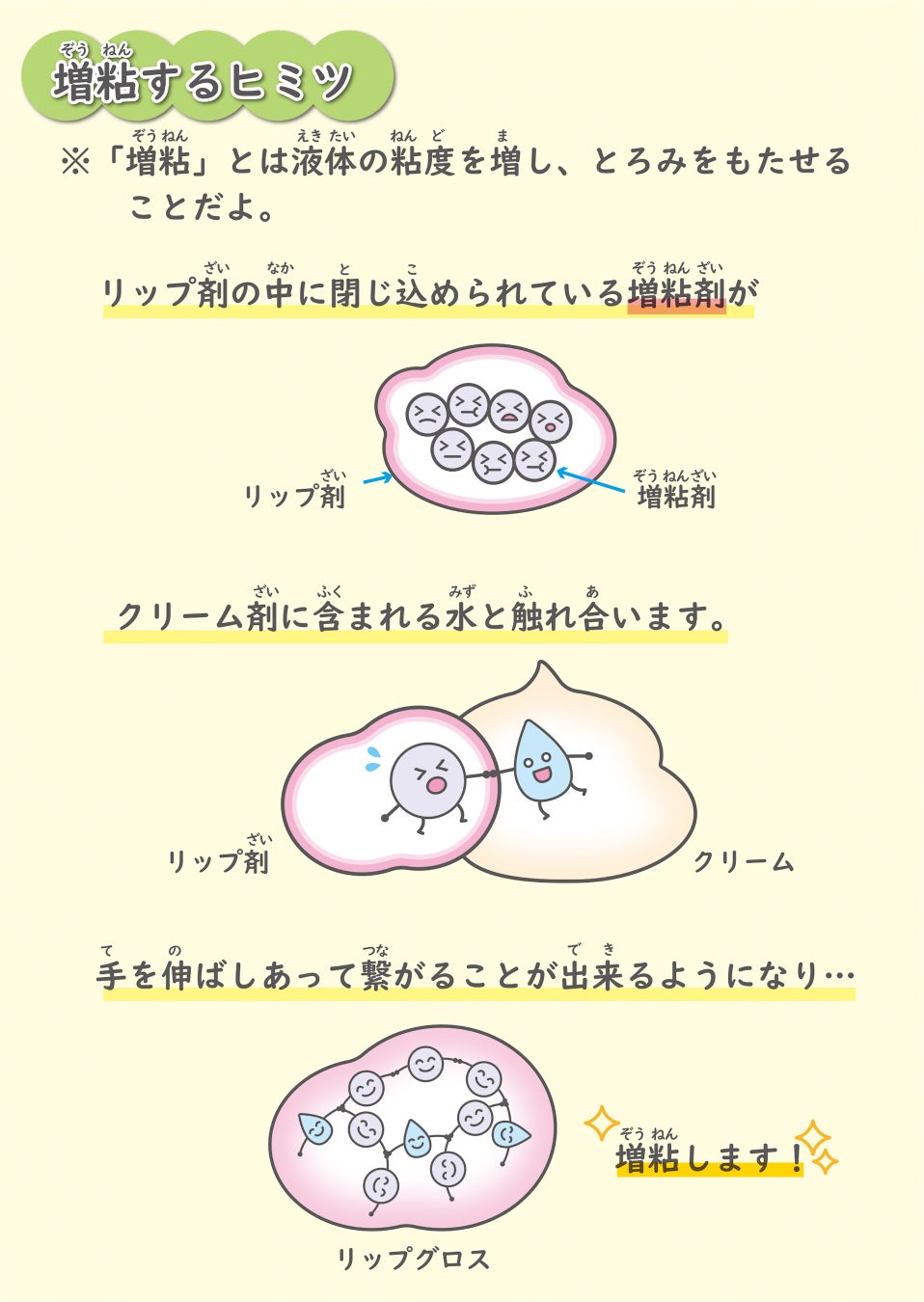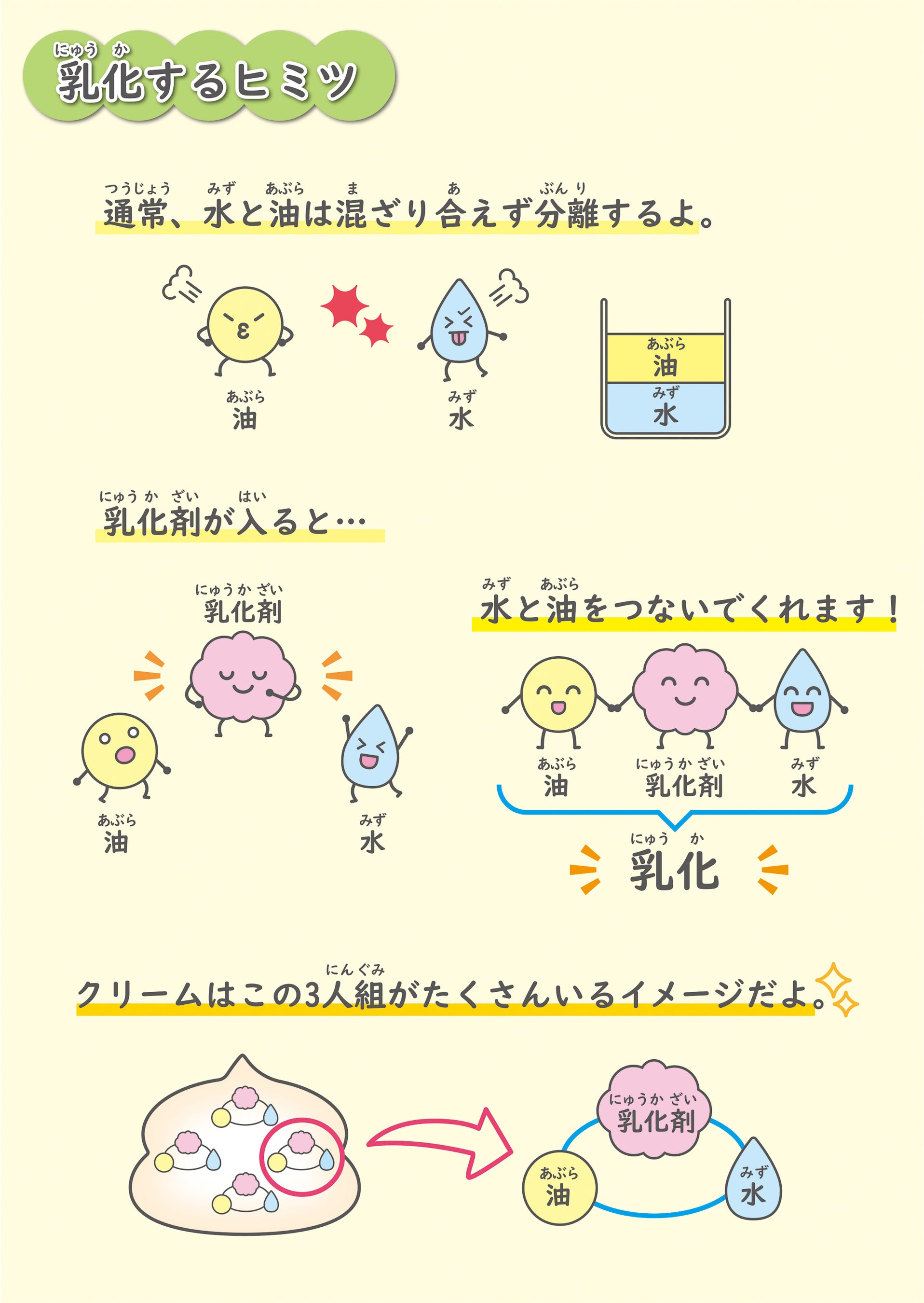 付属の化学反応BOOKでは、クリームのもとを混ぜた時の化学反応、「増粘するヒミツ」や「乳化するヒミツ」など、お勉強になる化学の豆知識もかわいいイラストとともに掲載しています。