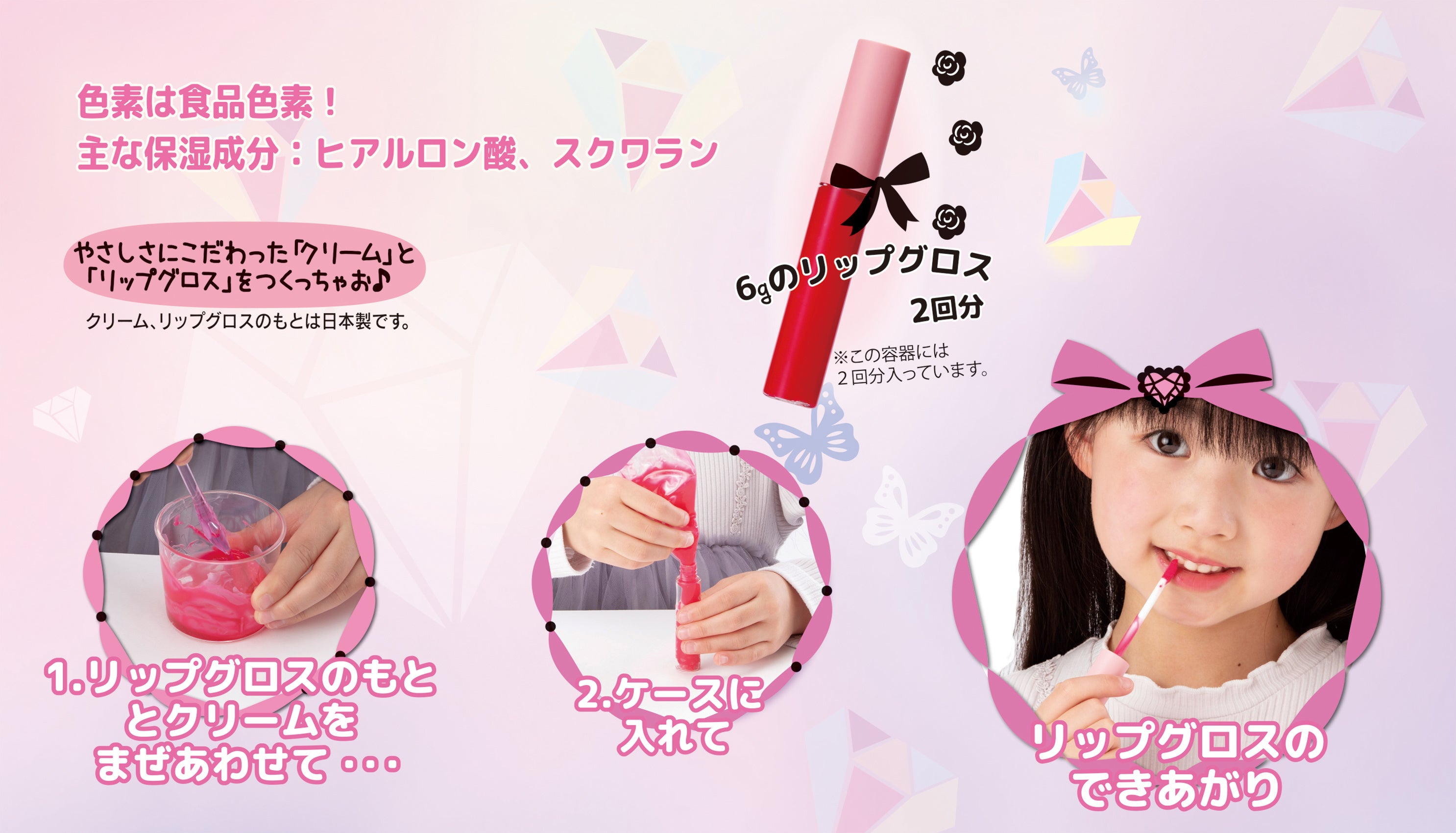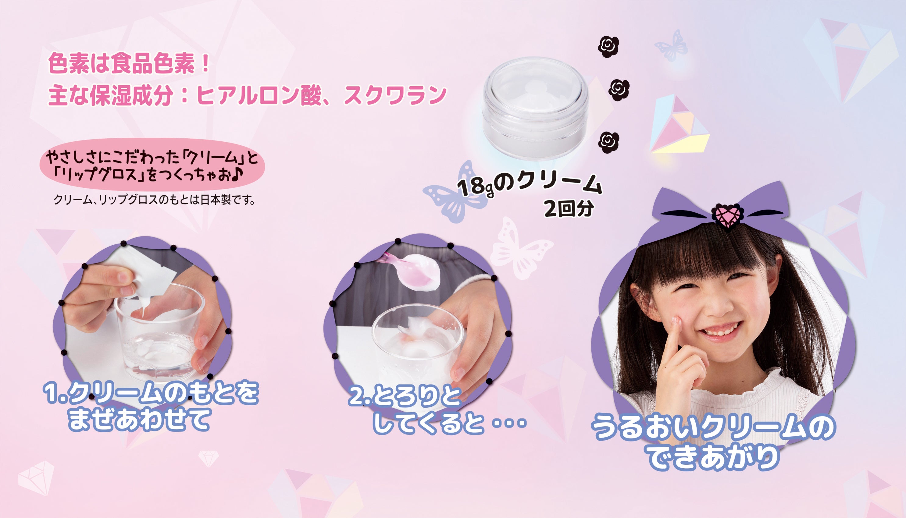 内容: クリームのもと①、クリームのもと②、リップグロスのもと①、リップグロスのもと②、カップ、クリーム容器、リップグロス容器、スティックスプーン、しぼり袋、デコラベル、化学反応ブック