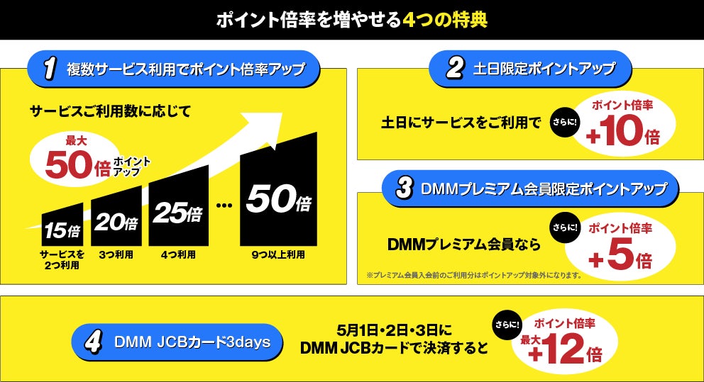 ①ポイント倍率最大50倍!DMMのサービスを複数ご利用でポイントアップ
