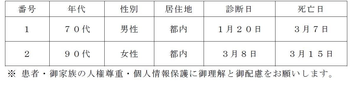 都内で新型コロナウイルスに感染した方が死亡されましたのでお知らせします。