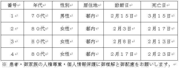 都内で新型コロナウイルスに感染した方が死亡されましたのでお知らせします。