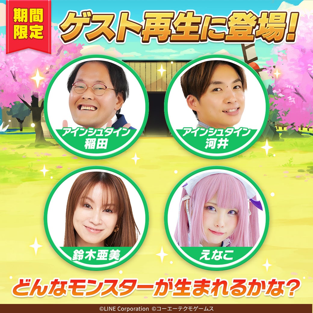 「LINE:モンスターファーム」のサービス開始を記念して、ゲーム内のフレンド再生に鈴木亜美さん、えなこさん、WEB CM出演中のお笑いコンビ・アインシュタインの稲田直樹さんと河井ゆずるさんが期間限定で登場します。