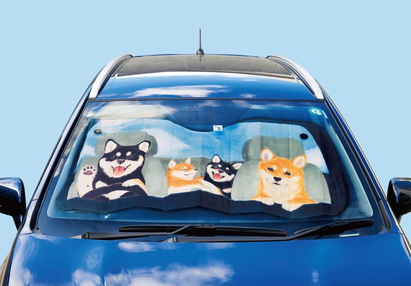 柴犬ファミリーがドライブ気分で飼い主の帰りを待つ姿にキュンとするサンシェードです。