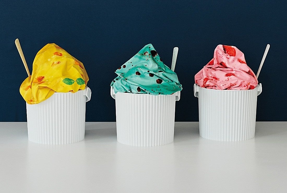 ジェラートの種類は〈チョコミント〉〈マンゴー〉〈いちご〉の3種類。両面にリアルなイラストのプリントを施し、どこから見ても涼やか。見ているだけで心が弾みます。