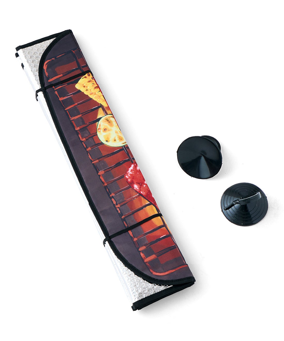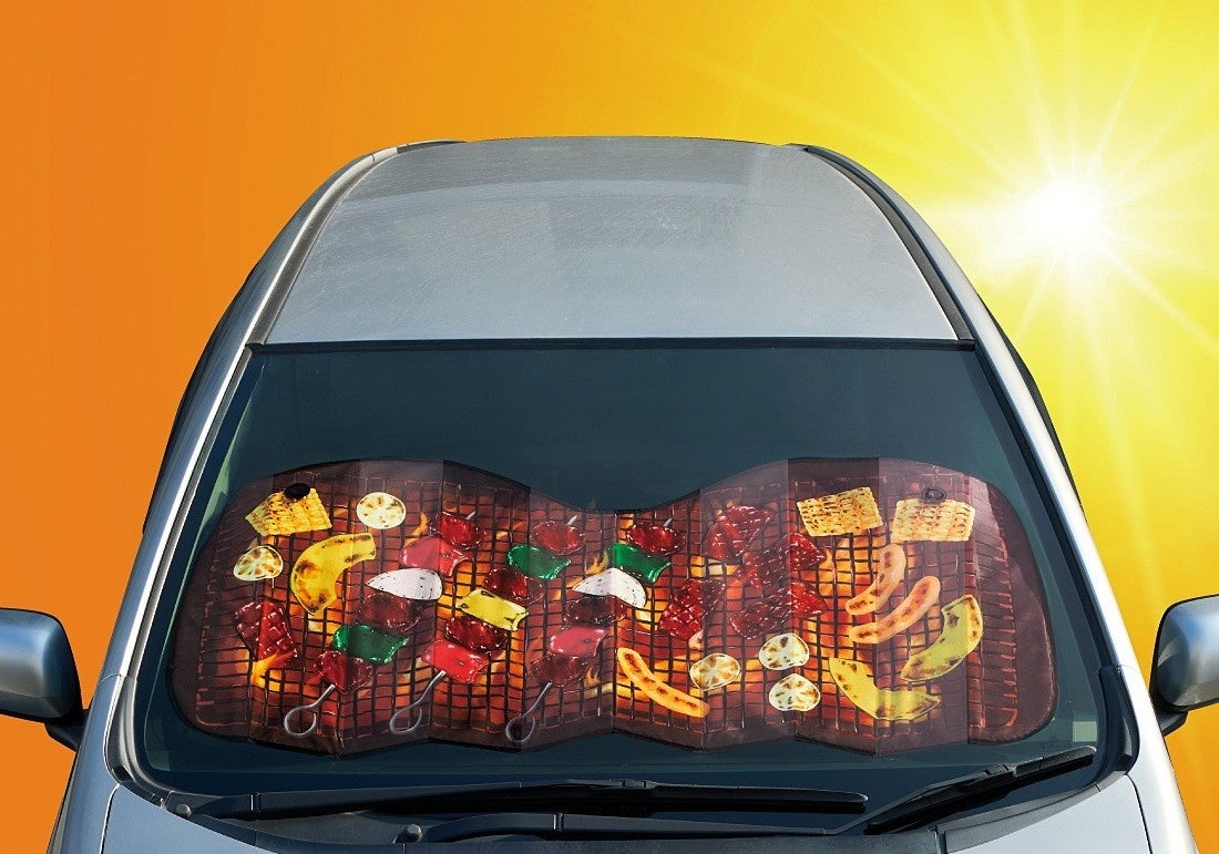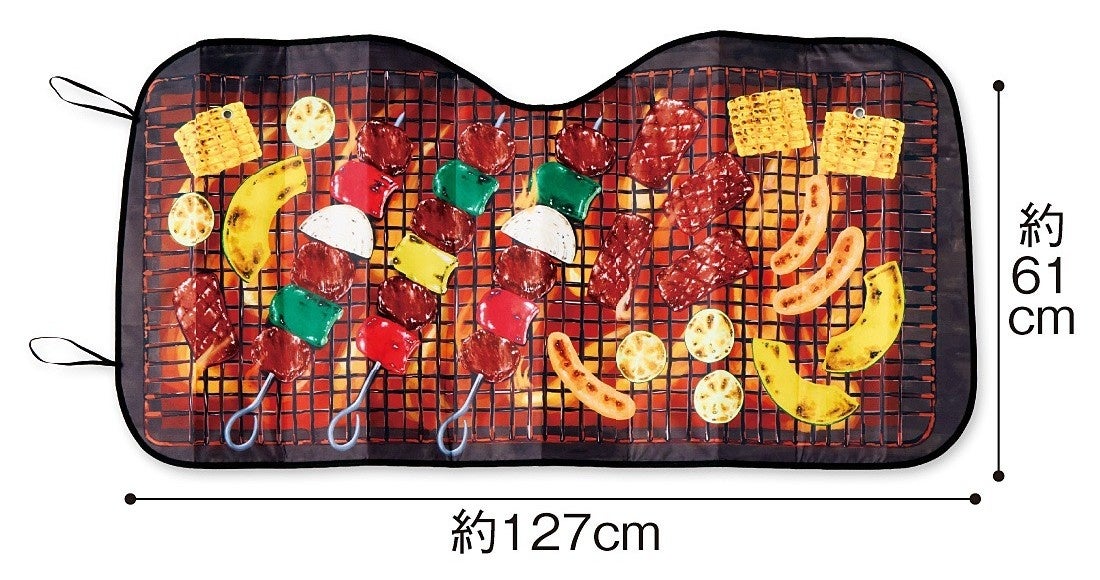 暑い季節に高温になる車内からイメージして、フロントガラスでバーベキューができるのでは? という発想から生まれた、インパクト抜群の車用のサンシェードです。おいしそうなBBQの具材がジュウジュウ焼かれているリアルなイラストが目を引くデザインで、広い駐車場でもすぐに自分の車だと見分けられそうです。