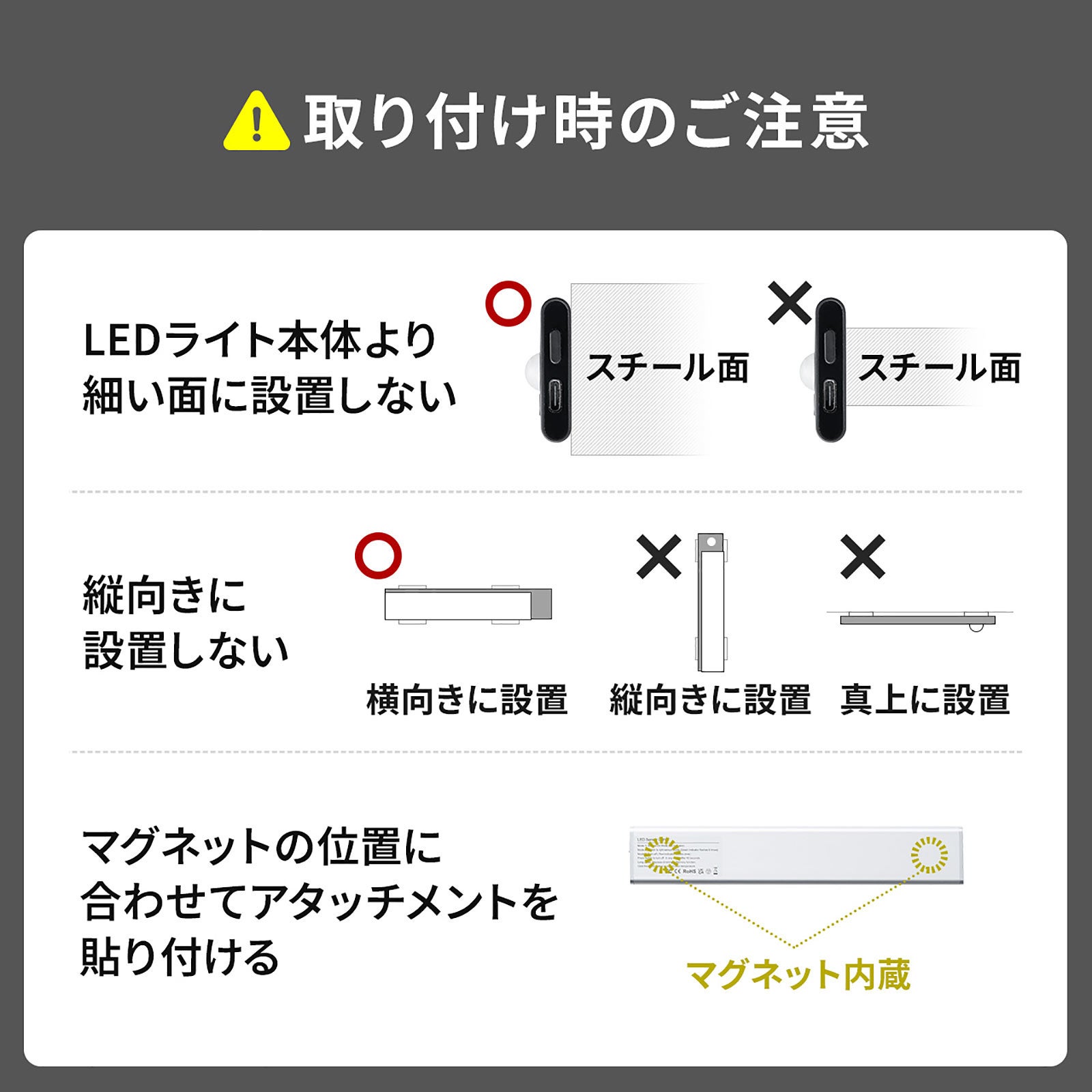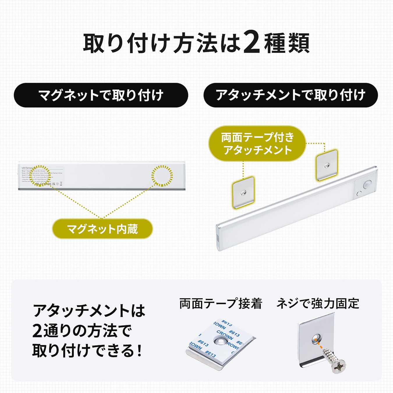 本体に内蔵されたマグネットで金属面に貼りつけたり、付属アタッチメントを使って好きな場所に設置したりできます。LEDライト本体とアタッチメントはマグネットで固定するため、簡単に着脱できます。