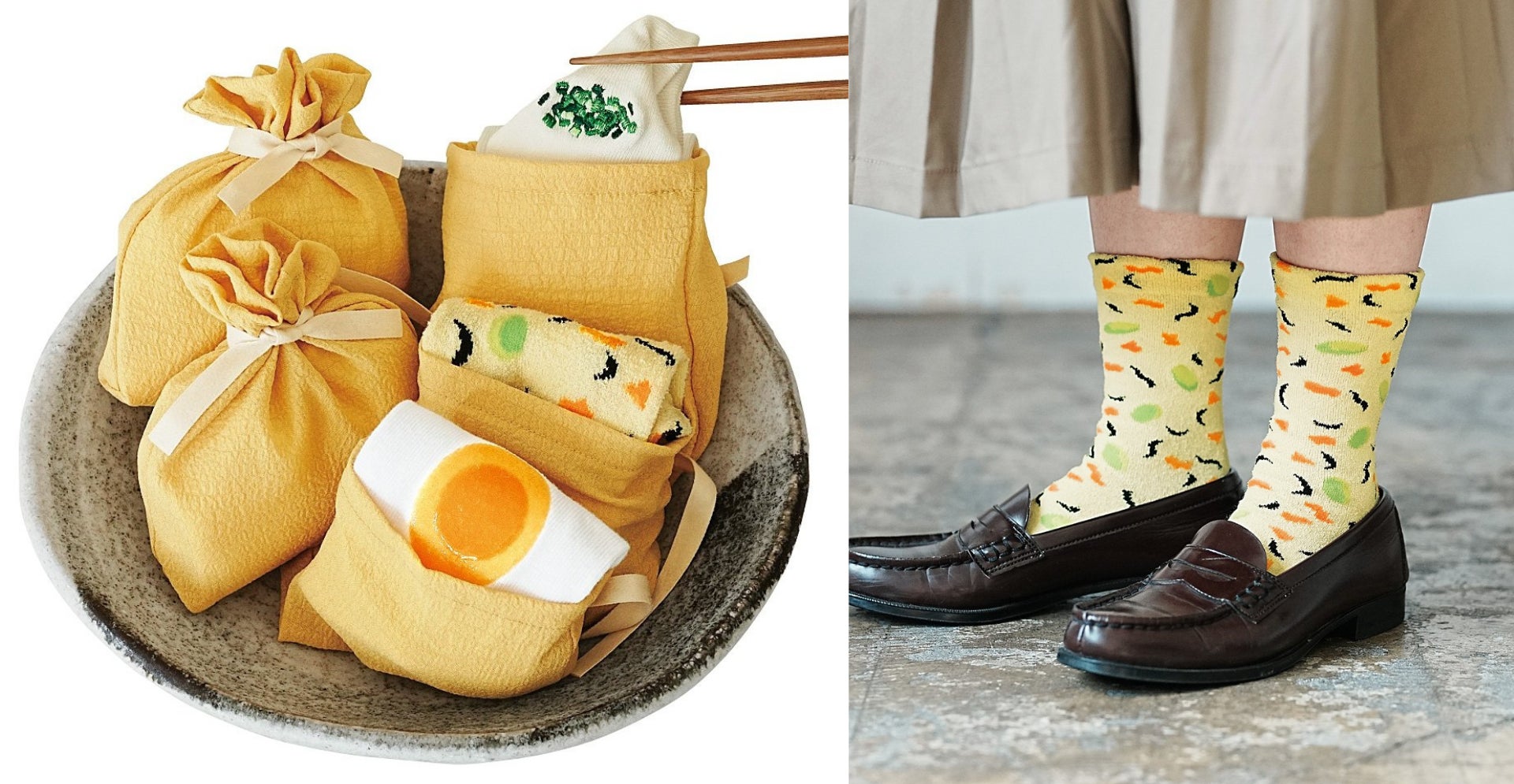 ちりめん風素材の油あげに、具材をモチーフにしたソックスが詰め込まれた巾着ソックスです。イラストや風合いにこだわったデザインで、毎日のおしゃれを楽しくしてくれます。