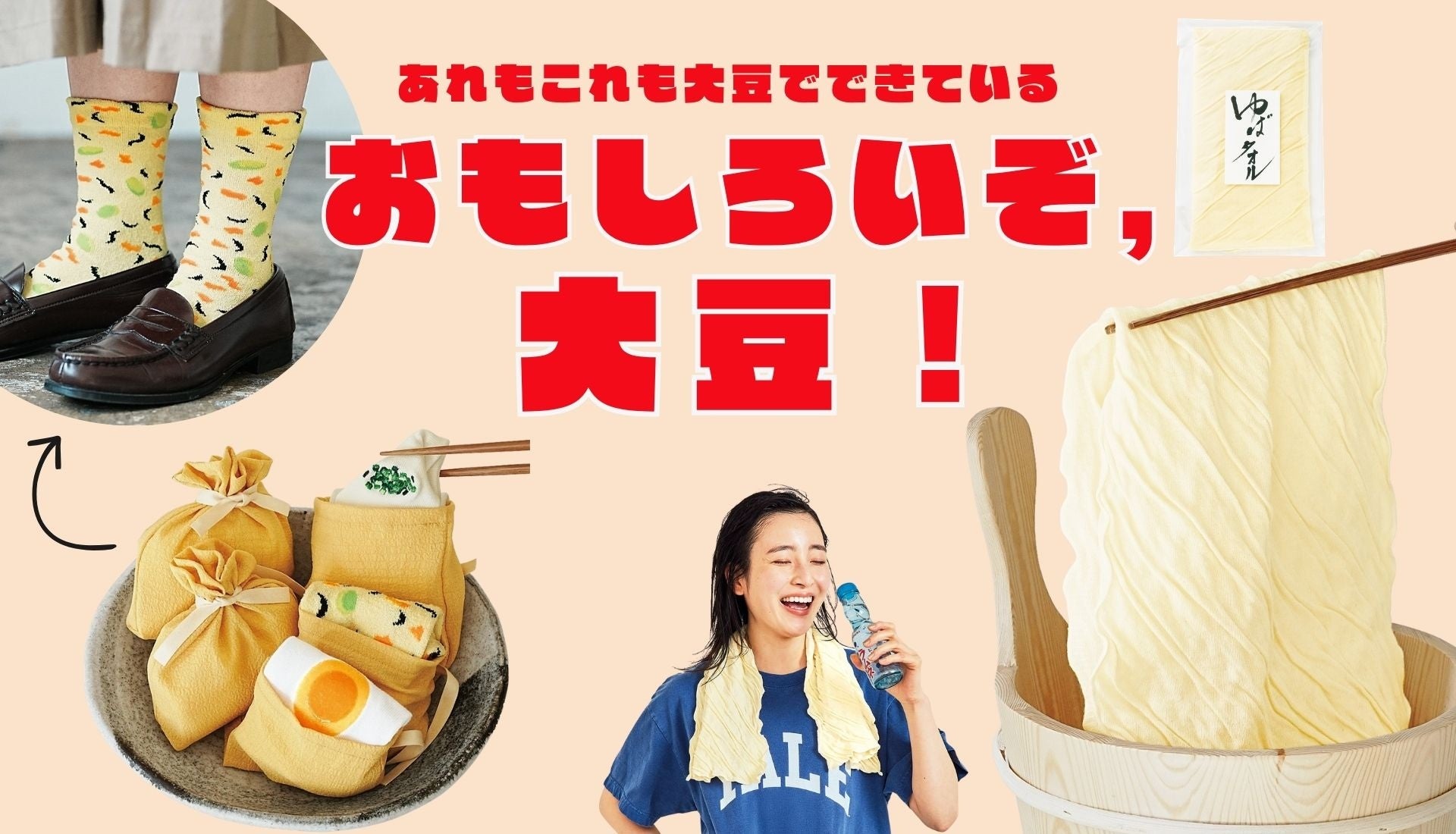 新生活を「まめ」に過ごせる2つの大豆商品がユーモアから新登場!リアルなしわを再現した「ゆばタオル」と、具材靴下を詰めた「油あげ巾着ソックス」。