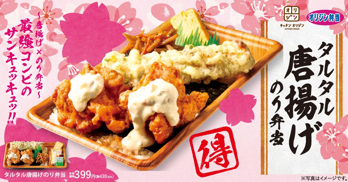 新生活が始まるこのタイミングに、新しいのり弁当ラインアップが増えました。定番メニューの「タルタルのり弁当」(297円)をお召し上がりくださっている皆様に、新しいメニューの弁当を楽しんでいただきたく、唐揚げが入ったのり弁当の提案です。メインのオリジン若鶏のこだわり醤油唐揚げで、食事の楽しさを感じてください。さらに、当社オリジナルのタルタルソースもお好みでどうぞ!