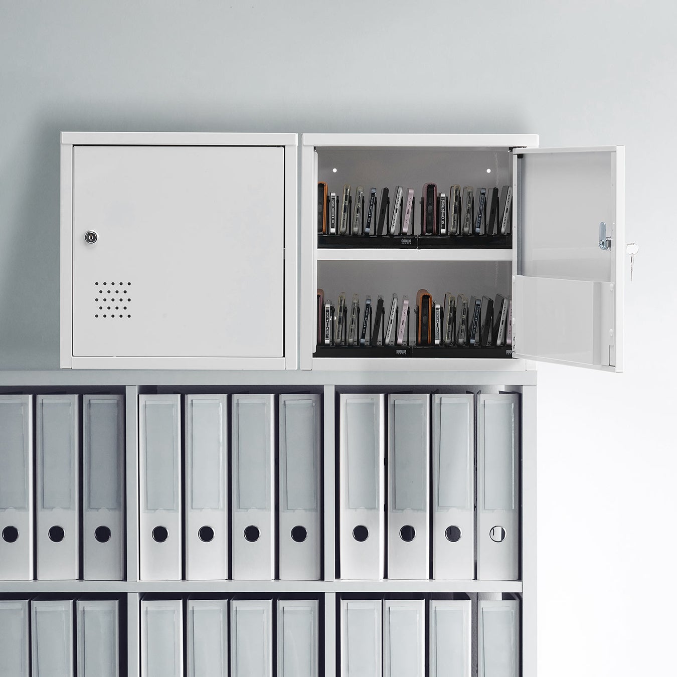 オフィス向けにはA4ファイルの収納、学校向けでは内部の棚板を使用してB5ファイルや電子機器などを分けての収納に便利です。扉の裏面にはトレーが付いており、説明書などの管理に最適です。棚板が1枚標準装備しています。