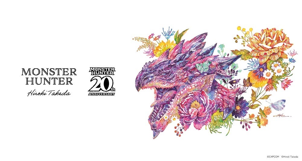 今回、雄大な自然の中で巨大なモンスターに立ち向かうハンティングアクションゲーム「モンスターハンター」シリーズが2024年3月で20周年を迎えることを祝し、緻密な筆使いや鮮やかな色遣いで動物と草花を融合させた水彩画を描く現代アーティスト「タケダヒロキ」に命の息づきを感じさせるコラボレーションアートを制作いただきました。