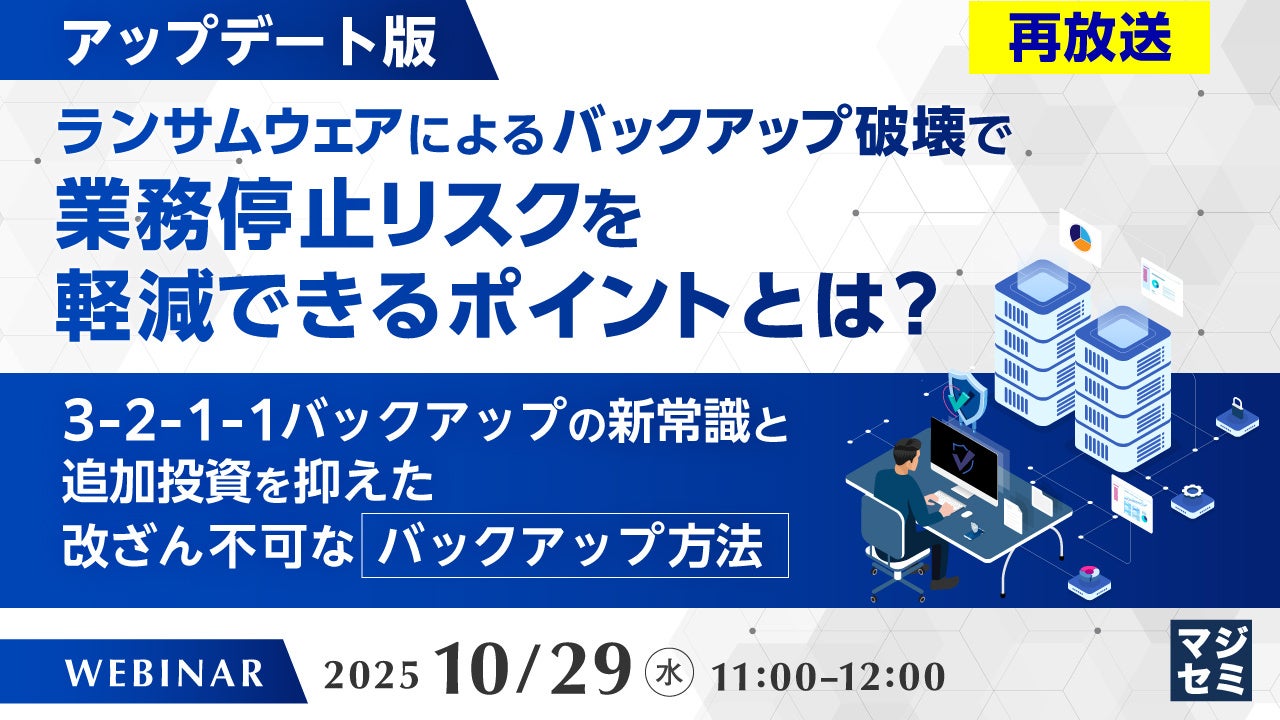 マジセミ株式会社は「(再放送)【アップデート版】ランサムウェアによるバックアップ破壊で業務停止リスクを軽減できるポイントとは?」というテーマのウェビナーを開催します。