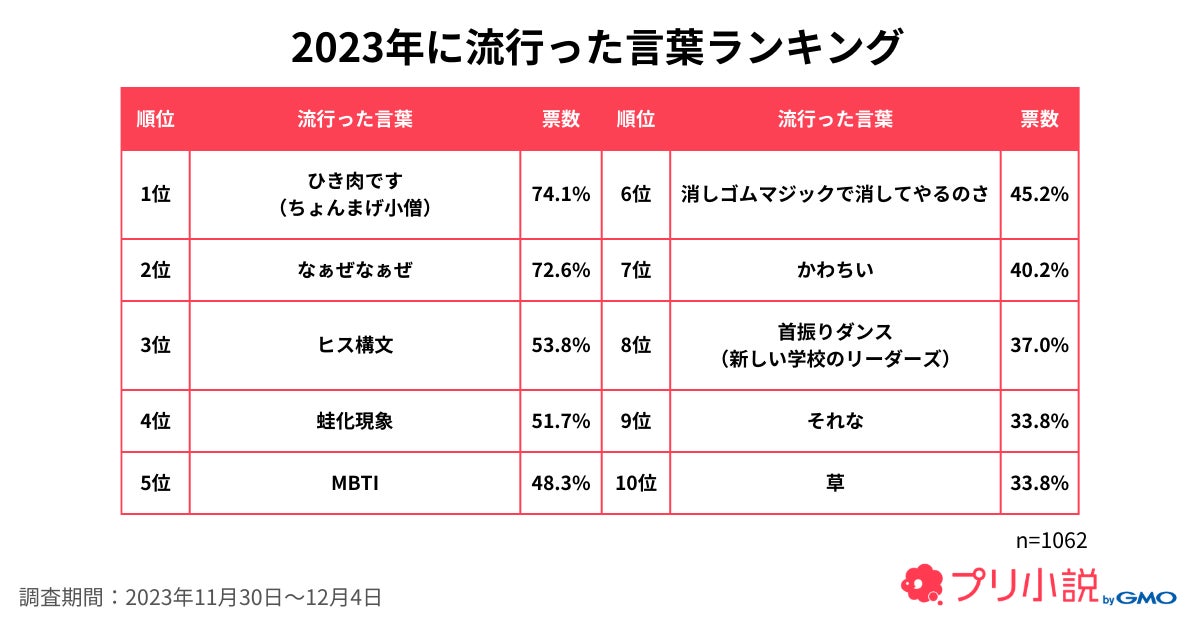 3位にはお笑いコンビ「ラランド」のサーヤさんが母親のヒステリックな言動をラジオやYouTubeで紹介したことをきっかけに話題となった「ヒス構文」(53.8%)がランクインしました。