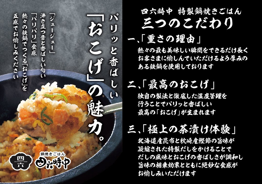 当社は、テイクアウトを主体としたファーストフード業態を新たな成長戦略と位置づけ、立地特性に応じて新業態を展開しております。この度、『海鮮丼・つけ麺四六時中』として営業してきた幕張新都心店を『鍋焼きごはん四六時中』に装いも新たにオープンいたします。『鍋焼きごはん四六時中』の特徴は、220℃に熱した熱々の鉄鍋で焼き上げたパリッと香ばしい「おこげ」。熱々の湯気やジュージューと焼きあがる音、パリッとした食感など、鍋焼きごはんは『五感』で愉しめる新業態です。