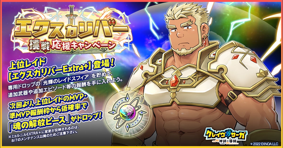光属性のエクスカリバーに有利な闇属性新キャラクターが登場! Extra+のレイド攻略に有効な特効スキル持ちのSSR魂友「ロサ」とSSR神器「アルテミオン」がピックアップされた「エクスカリバー挑戦特効ガチャ」をお見逃しなく。