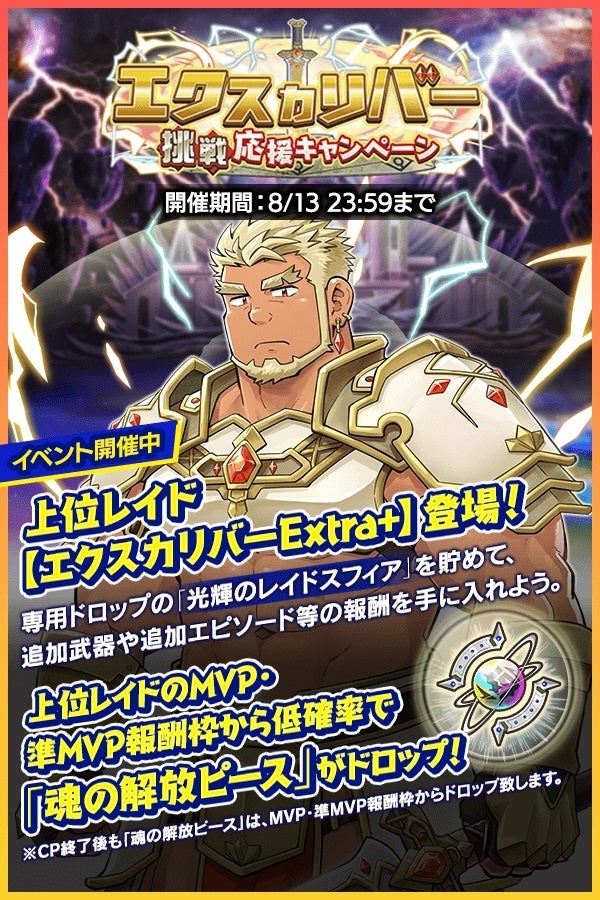 キャンペーン期間中はレイド救援時の消費RPが半減するほか、エクスカリバーExtra+の挑戦回数が2回増加いたします。さらに交換所の一部アイテムが20%割引で交換可能!