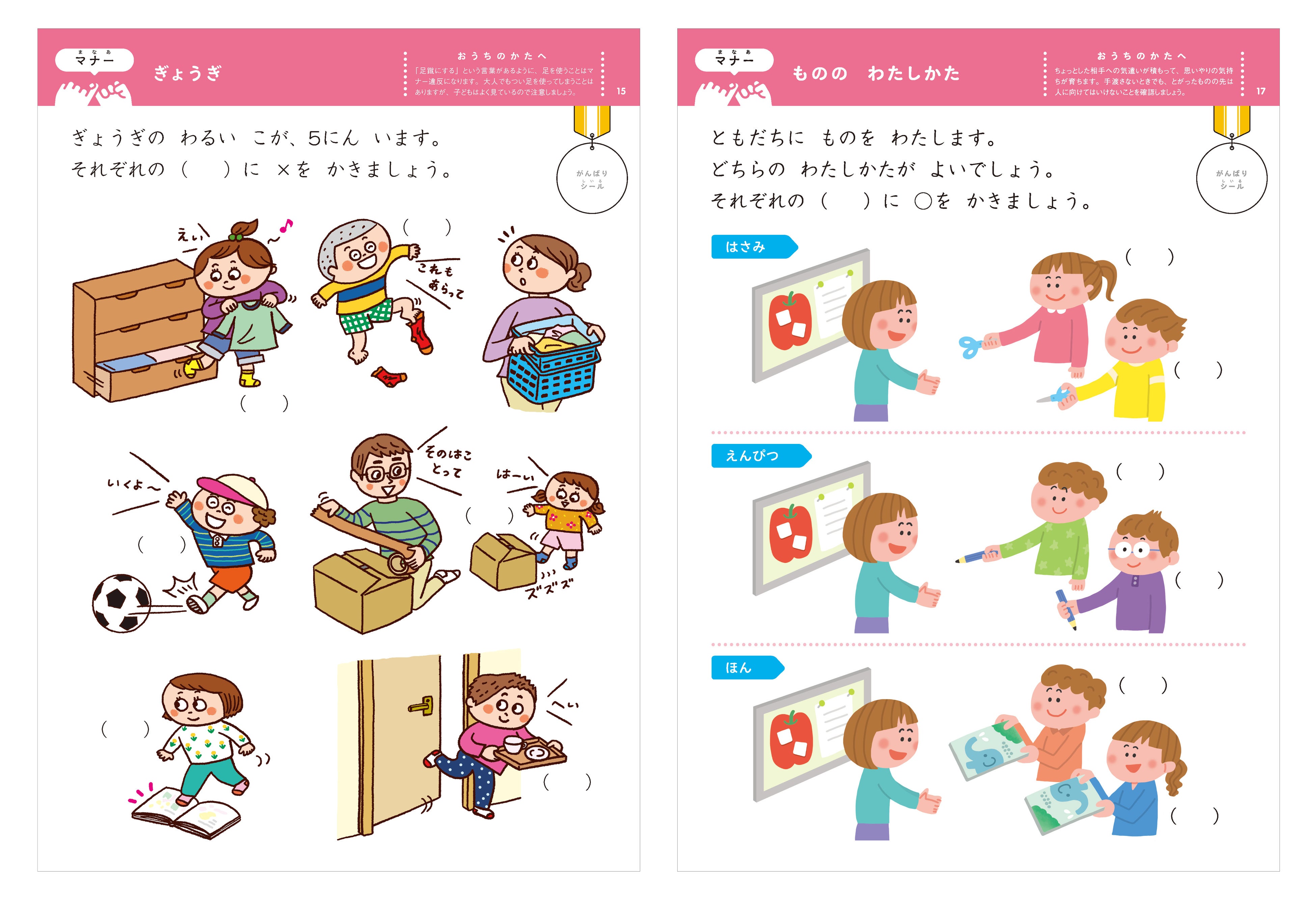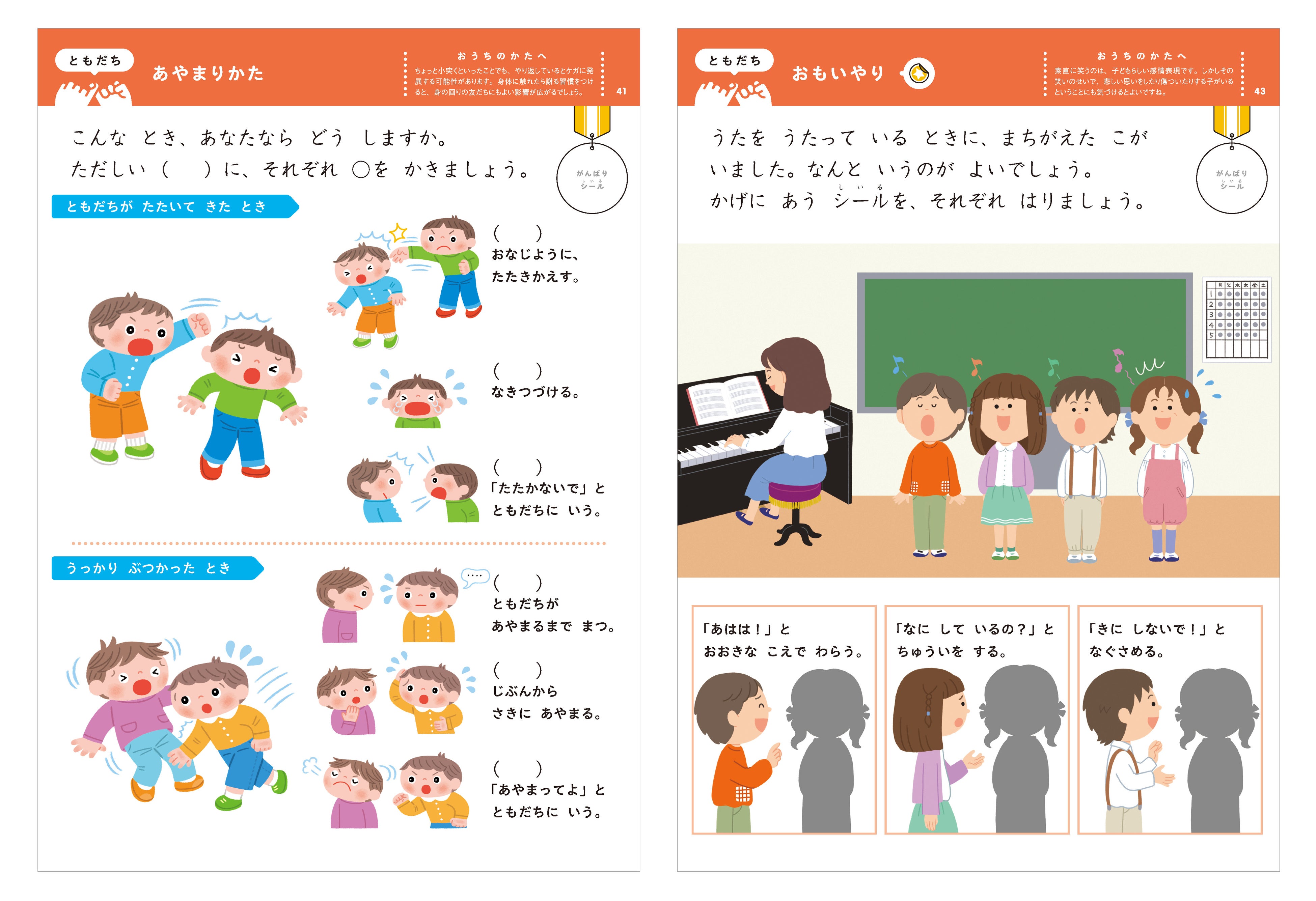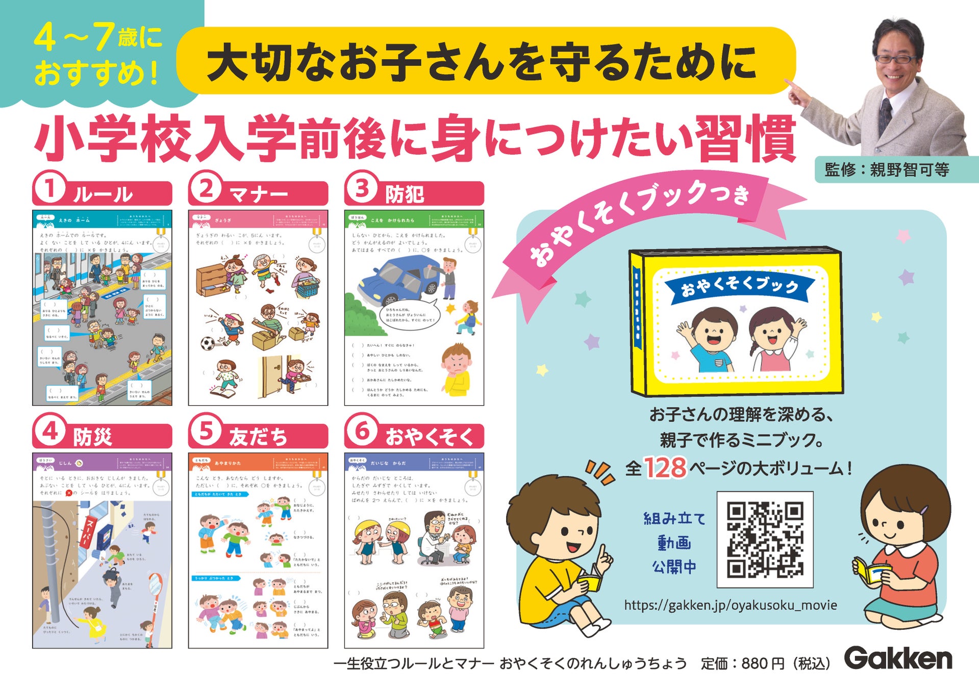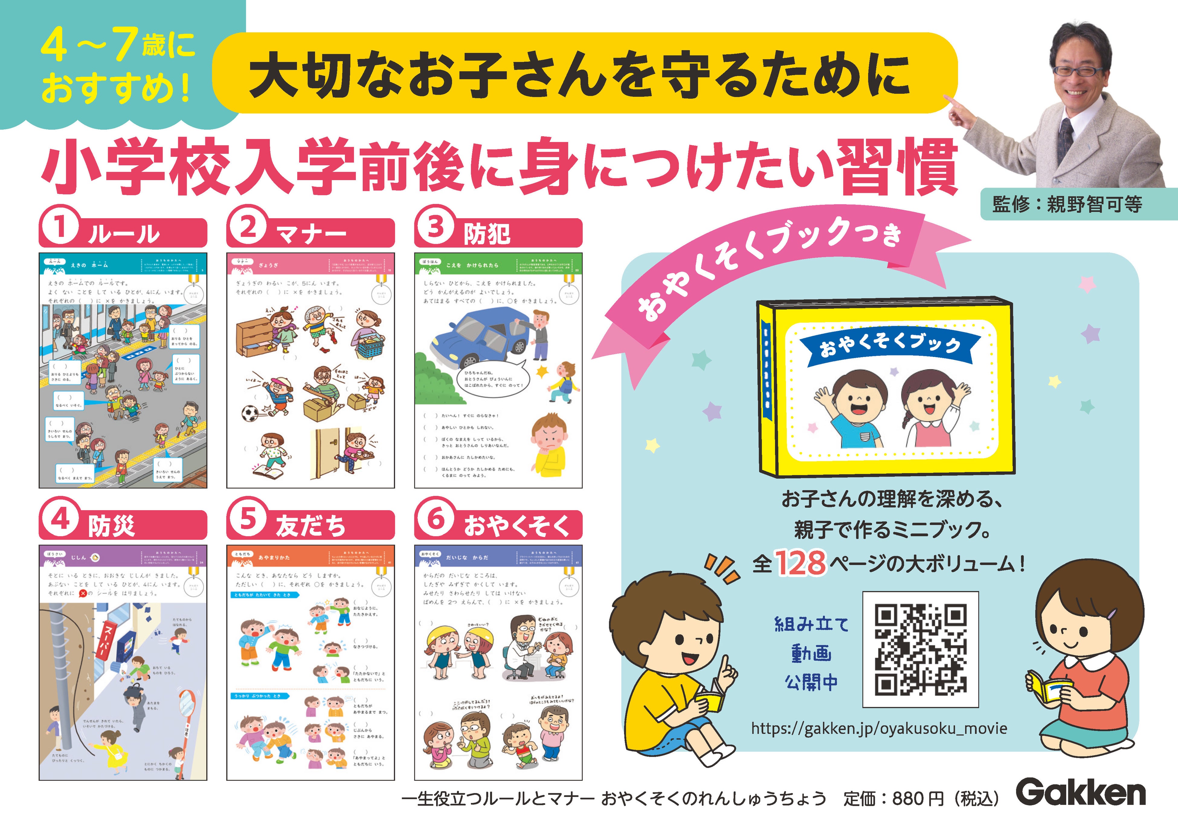 行動範囲が広がる年齢だからこそ。小学校入学前後に身につけたい、「おやくそく」を厳選! ミシン目つきの巻末ページを組み立てると、豪華128ページのミニブックが完成。いつでも「おやくそく」を確認できます。