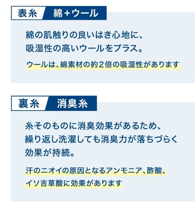 表糸に肌触りの良い綿と吸湿性の高いウール素材、裏糸に消臭糸を使用しています。90%以上の高い臭気減少率、素早い消臭効果、100回洗濯した後でも消臭効果の持続性を備えた、機能性の高い消臭ソックスです。