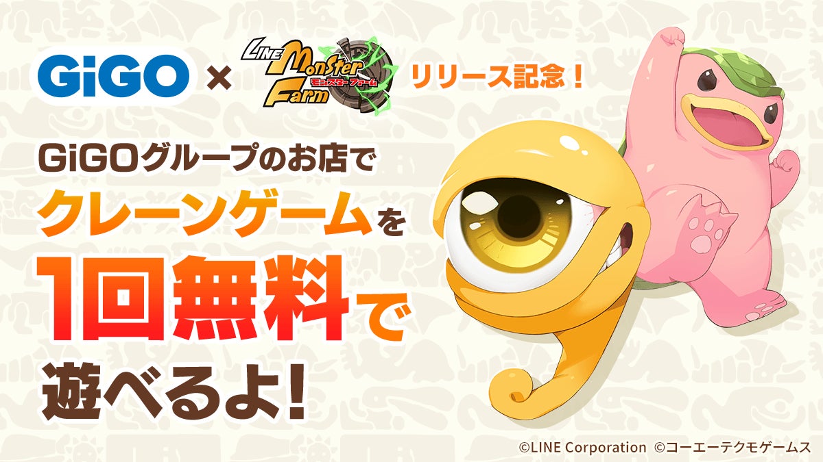 モンスター育成シミュレーションゲーム「LINE:モンスターファーム」のサービス開始を記念して、本日より、アミューズメント施設「GiGO」とのコラボキャンペーンを開催します。GiGOグループのお店でクレーンゲームが1回無料で遊べるクーポンがもらえるお得なキャンペーンですので、ぜひご参加ください。