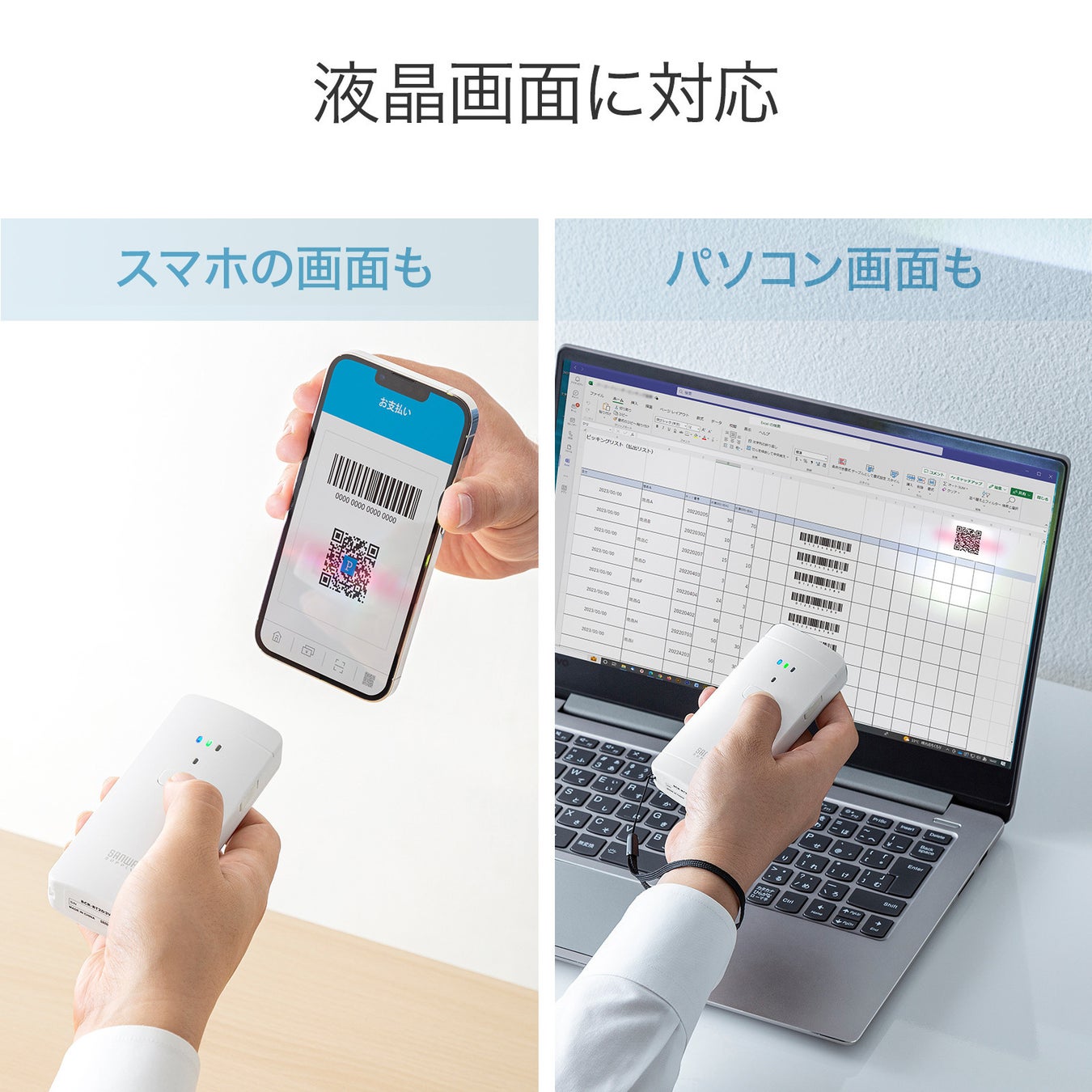 画面読み取りにも対応しており、パソコンやスマートフォンの画面に表示されているコードの読み取りも可能です。スマートフォンで決済をする際のQR決済の読み込みが可能なので、コンビニなどでの利用に最適です。