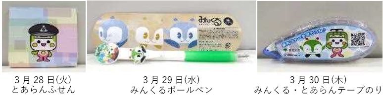 オープン記念キャンペーンとして、3月28日(火)から30日(木)の3日間、各日お買い上げの先着100名様に都営交通限定ノベルティ「とあらんふせん」「みんくるボールペン」「みんくる・とあらんテープのり」を1つプレゼントいたします。