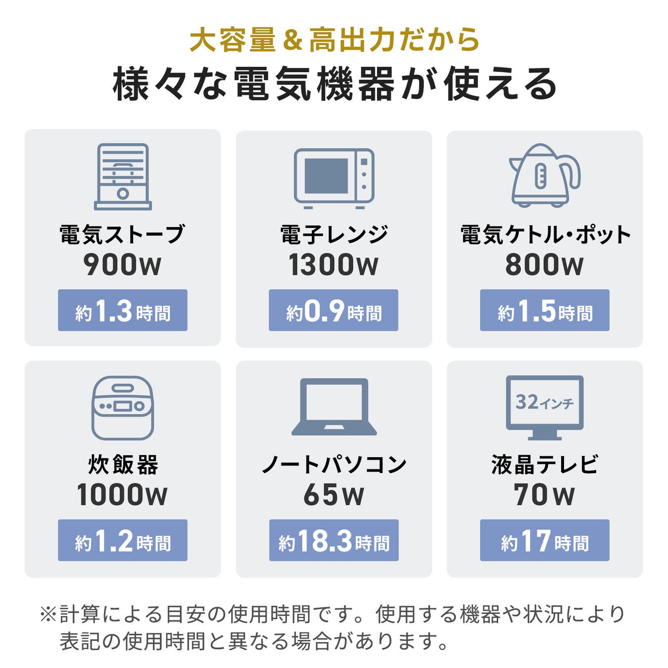 電池容量1485Wh、AC定格出力1500Wで大容量・高出力を実現した高出力タイプのポータブル電源です。AC出力は正弦波を採用しており、家庭用100Vコンセントと同じような滑らかな波形を作り出します。コンセントがない場所でも、パソコンやディスプレイ、電子レンジ、暖房器具など幅広い家電製品が使用できます。