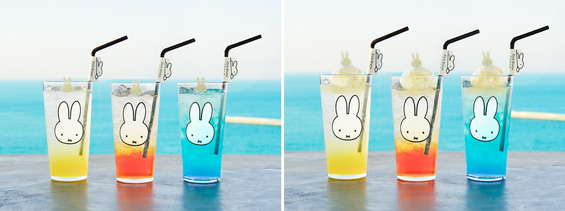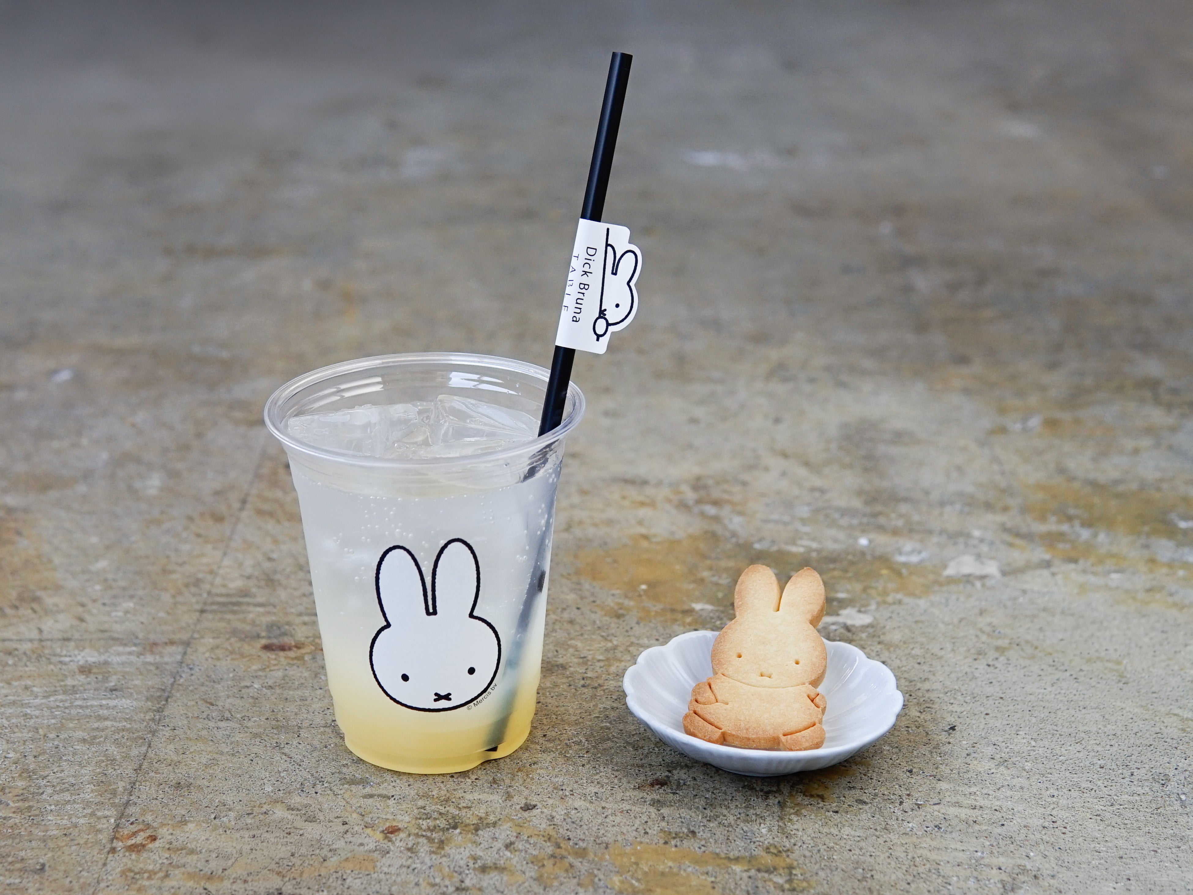 同時にお楽しみいただけるコラボドリンクはストローにディック・ブルーナ テーブルのタグと、ミッフィーのお顔が付いたグラスでお楽しみいただけます。