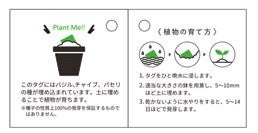 再生古紙に、ハーブの種(バジル、チャイプ、パセリ)をすき込んだ環境にやさしいタグを使用しています。タグを一晩水に浸けて、土に埋めると数日で発芽し、紙の部分は徐々に分解され数カ月で土に還ります。