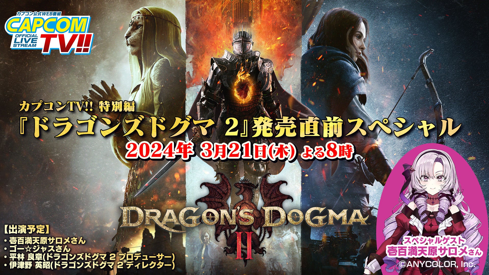 いよいよ2024年3月22日(金)発売が迫る『ドラゴンズドグマ 2』。発売直前の3月21日(木)のよる8時から特番の放送が決定! スペシャルゲストに人気バーチャルライバーの壱百満天原サロメさんをお招きして本作の魅力をお伝えします! 番組ではすでに告知がされているサロメさんの「公式ポーン」もお披露目! 実機を使用したサロメさんのゲームプレイにも注目! さらに宇宙海賊のゴー☆ジャスさんも来てくれます! お見逃しなく!