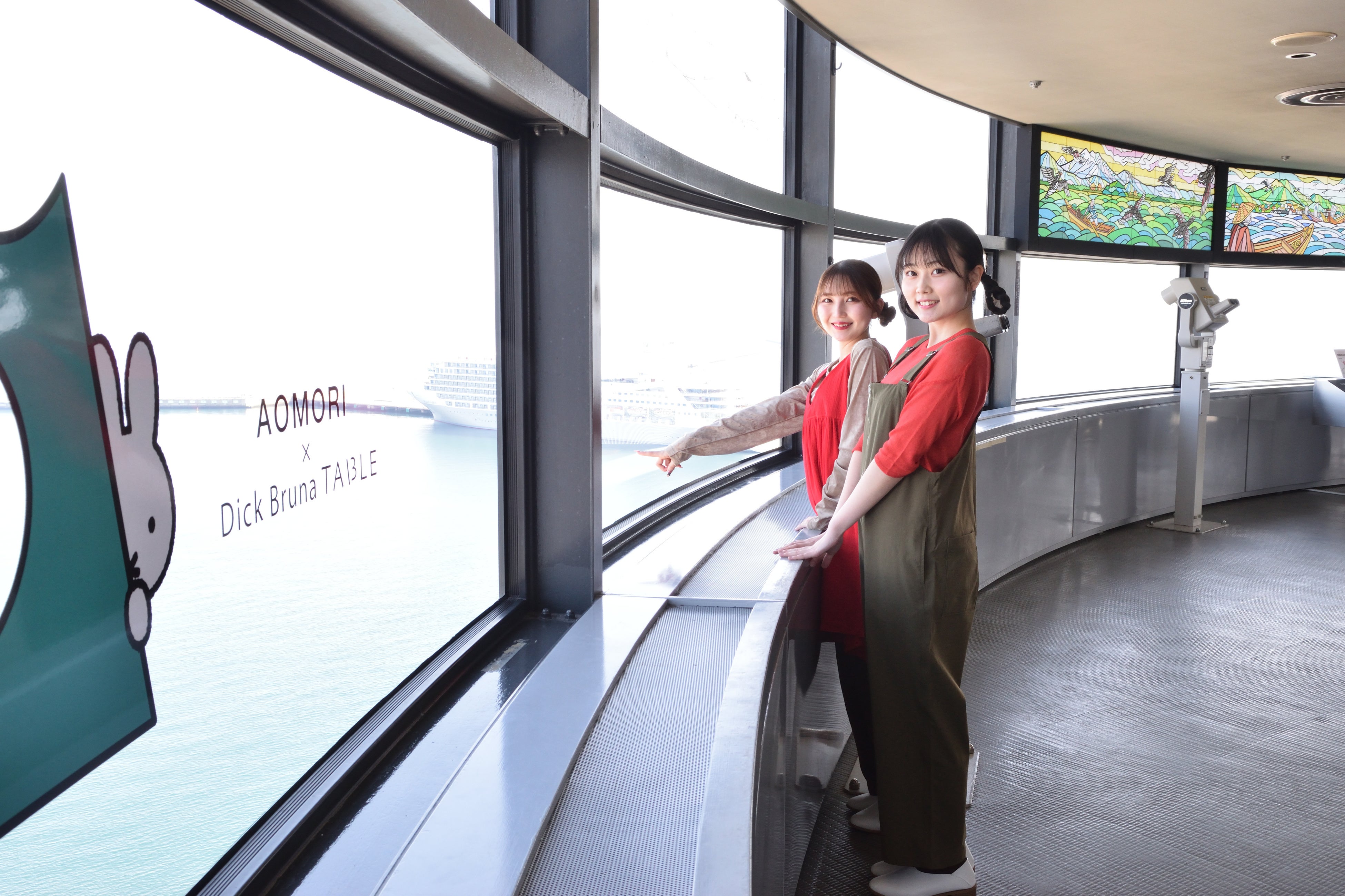 展望台にはミッフィーのフォトスポットが4ヵ所出現し、青森の景色とともにその姿を見ることができます。青森の海にミッフィーが浮かんでいるかのような姿にりんご娘さんたちに思わず笑みがこぼれます。さらに隣接する青い海公園にはミッフィーのお顔が!見つけた瞬間、「わあーーーー!!」と驚きの声が上がりました。