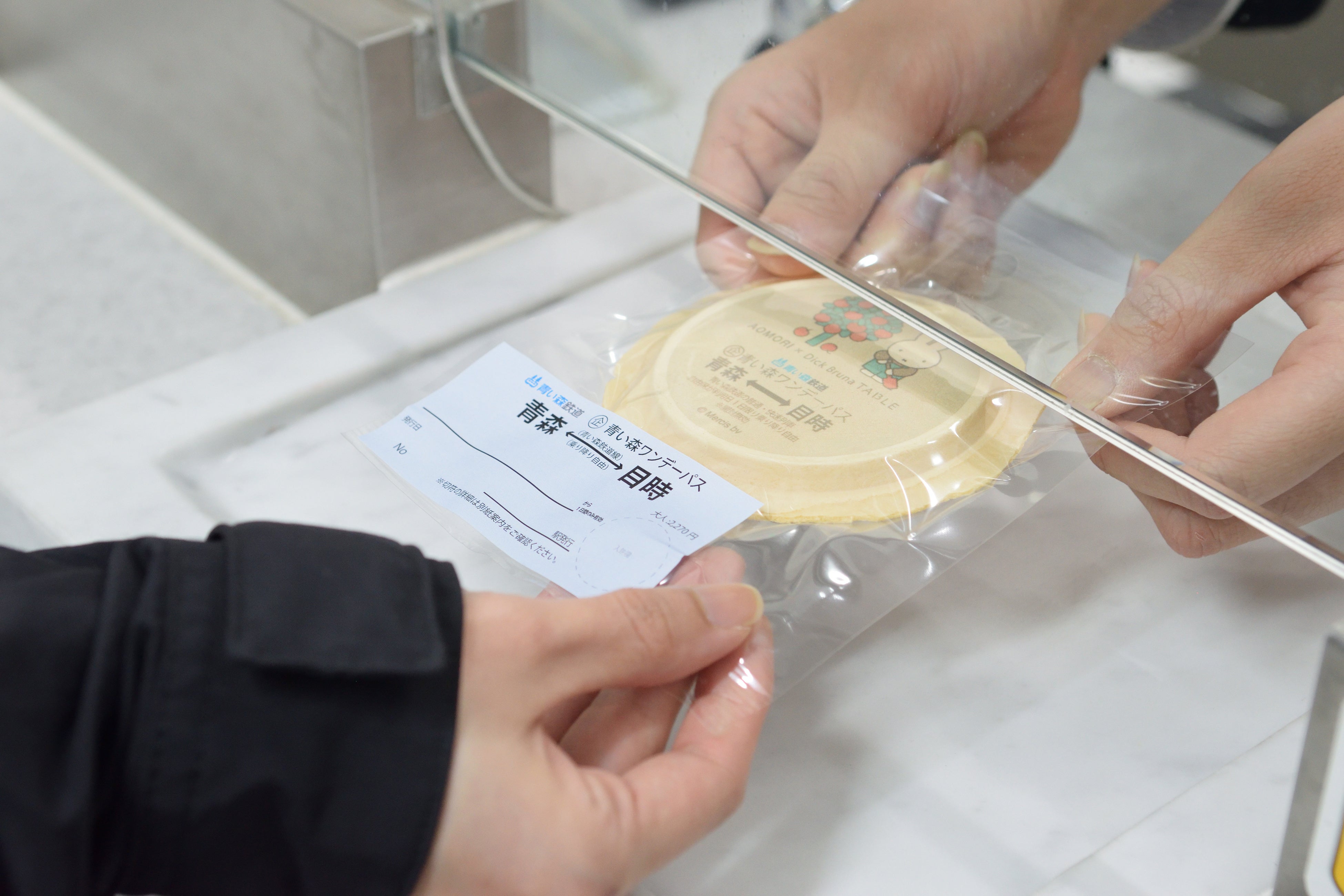 青い森鉄道では2種類のコラボデザインチケットを展開。2種のうち、「青い森ワンデーパス」は青森ならではの南部せんべいに印刷された、「食べられる切符」です。