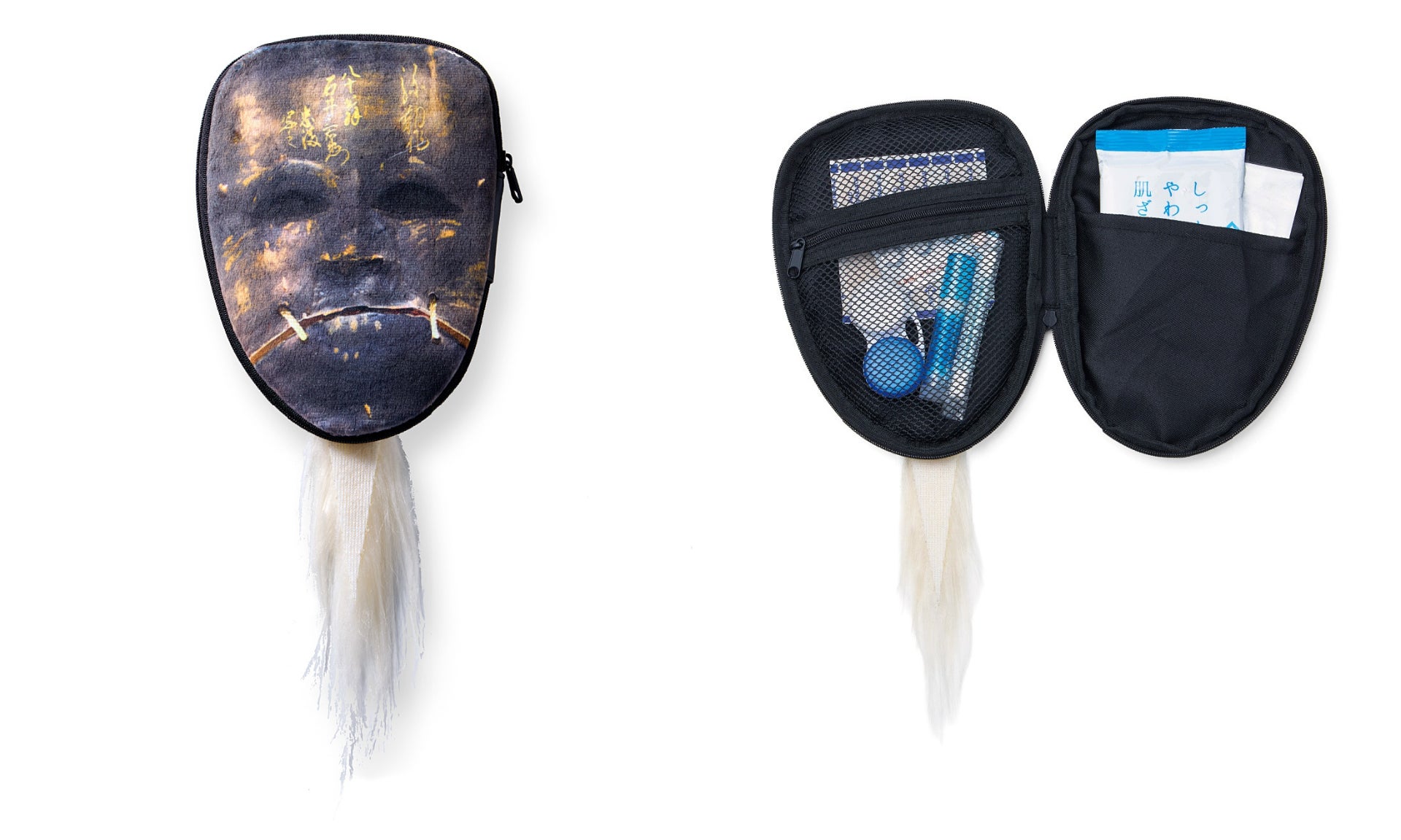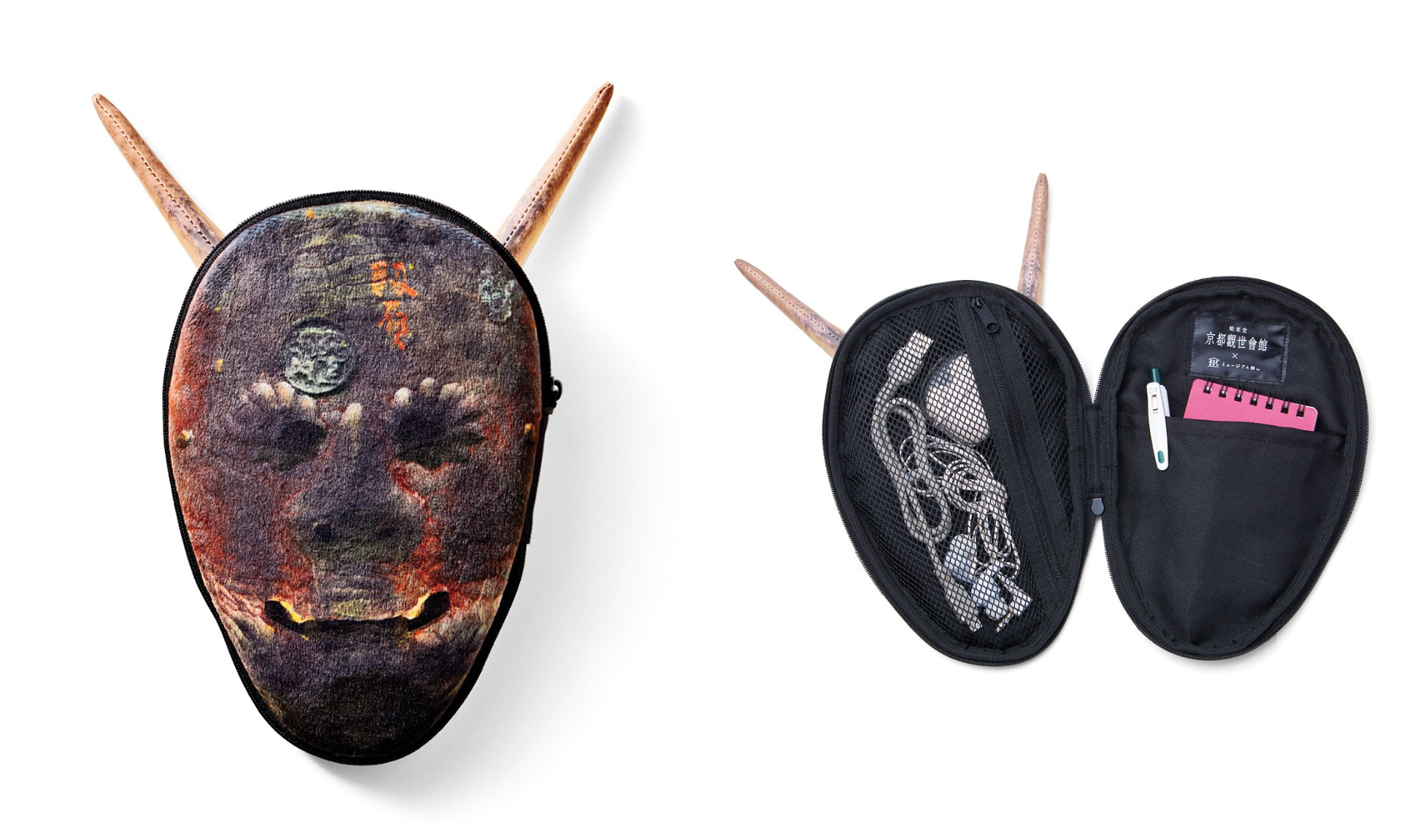 般若の面と同様に、裏面までリアルに表現されています。内側は横ファスナーのメッシュポケットとマルチに使えるオープンポケット仕様です。文房具や常備薬などを入れるのにもおすすめです。