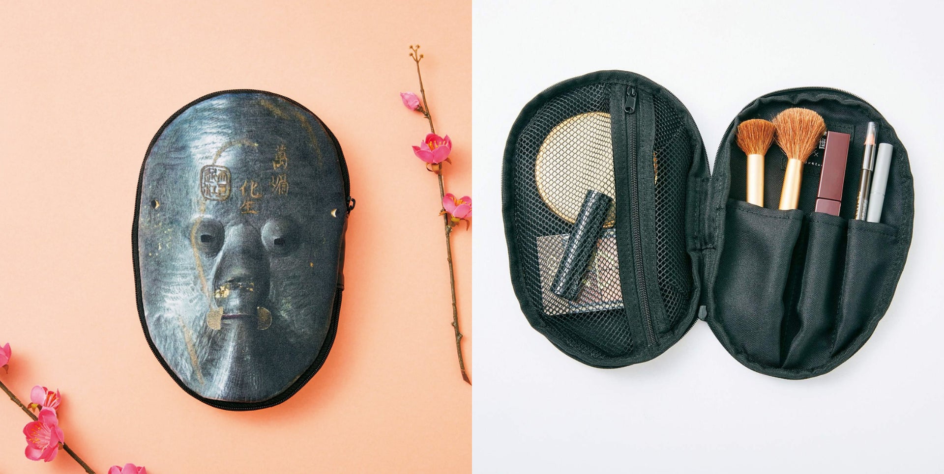 ポーチの裏面は、「化生の面」の裏面をプリントでリアルに再現しています。内側には縦ファスナーのメッシュポケットと細長ホルダーが付いていて、コスメアイテムの収納にぴったりです。
