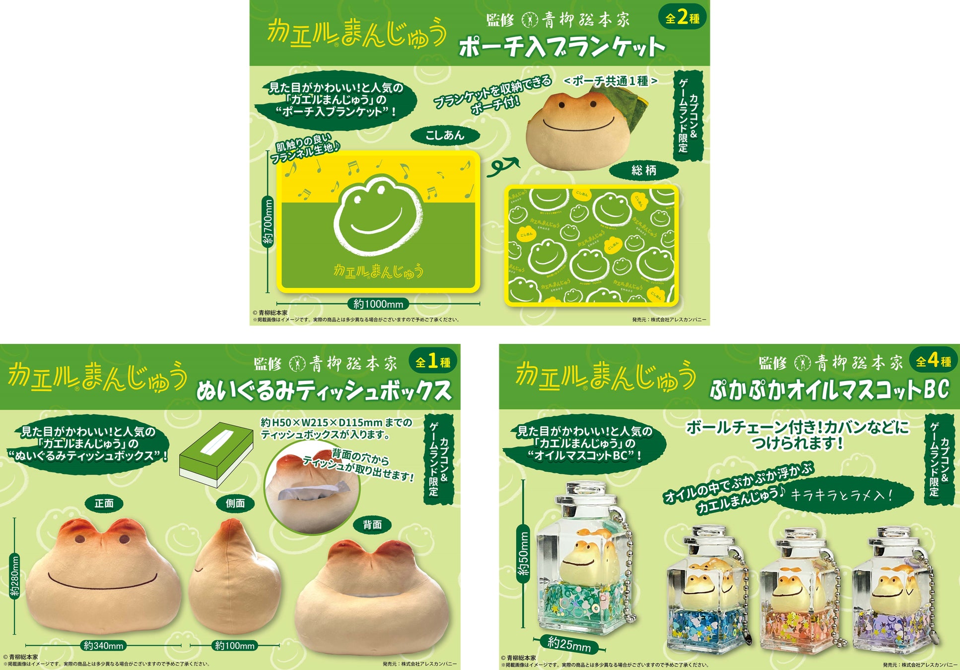 お馴染みのパッケージデザインをイメージした「ポーチ入ブランケット」や、『カエルまんじゅう』からティッシュが取り出せちゃう「ぬいぐるみティッシュボックス」、ミニ『カエルまんじゅう』が浮かぶ「ぷかぷかオイルマスコット」のかわいくて実用的な3アイテムが登場。
