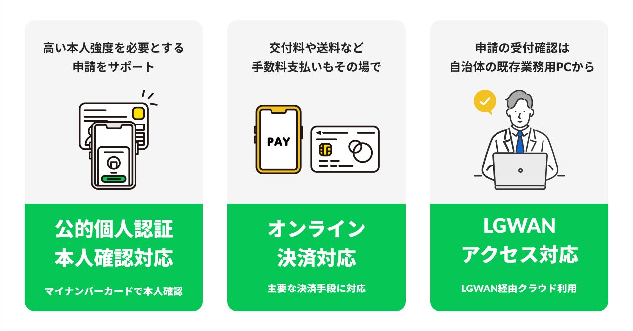 今回は“行かない役所・書かない役所”の実現に向けて、大川市が現在受け付けている全9種類の行政手続で「スマート公共ラボ電子申請」の運用を開始。LINE上でのマイナンバーカードによる公的個人認証に対応することで、別途アプリ等のダウンロードを必要とすることなく、LINE上の操作のみで申込から決済までの全ての申請手続きが可能になります。また、今までクレジットカードのみであった決済手段もQR決済・バーコード決済に対応、利用者のさらなる利便性向上を図ります。