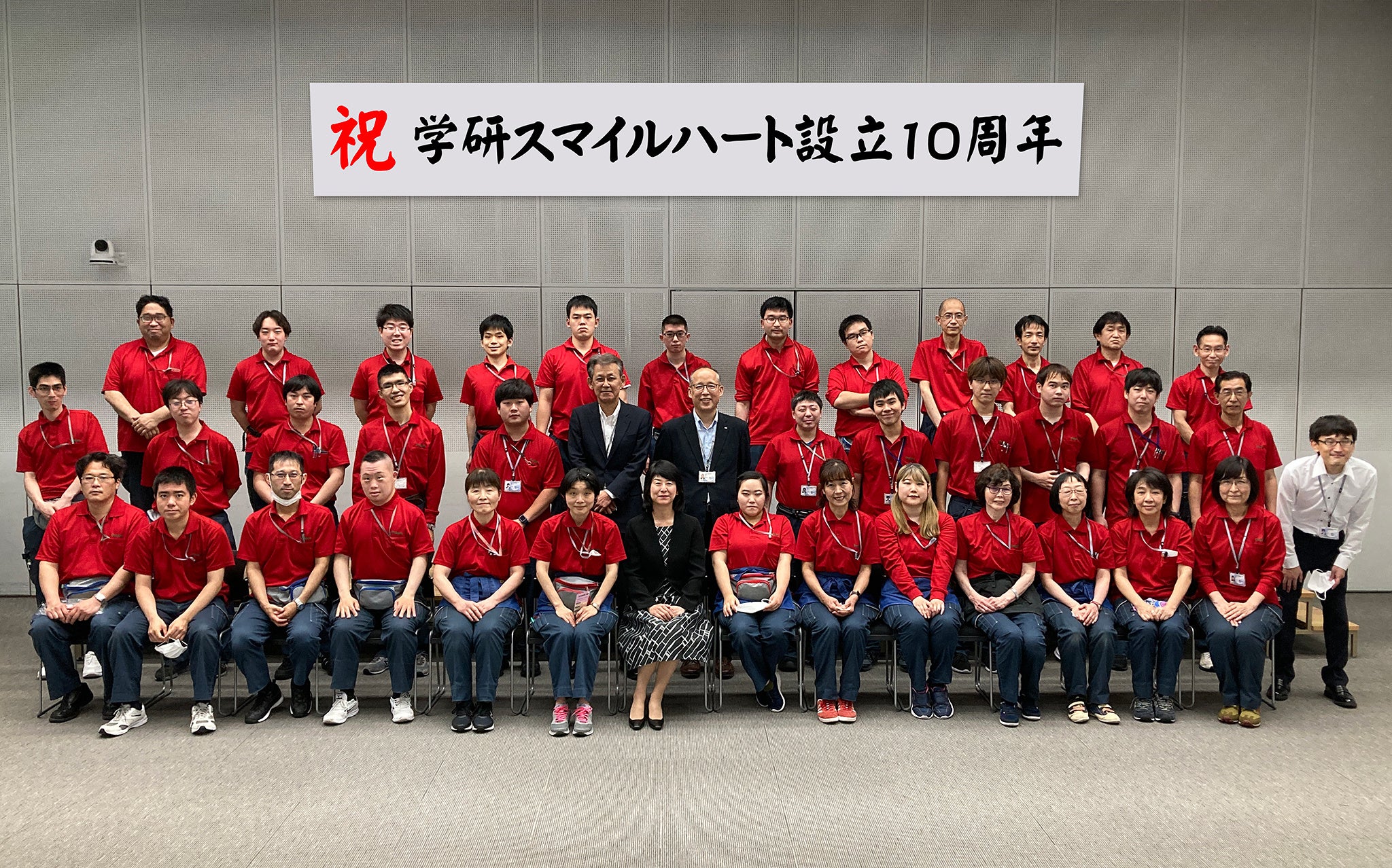 2012年6月に学研グループの障害者雇用促進を目的に設立された、株式会社学研ホールディングス100%出資の特例子会社です。2013年にグループ適用制度(関係会社特例制度)の認定を受け、現在10社でグループを組んでいます。社名の由来である「笑顔と真心」を大切にし、65名(2022年7月1日現在)の障がい者がオフィス業務のバックアップやビルメンテナンス、メールセンターなどの業務に従事しています。今後も「更なる業務拡大による雇用機会の創出」と「障がい者が働きやすい職場環境づくり」に積極的に取り組んでまいります。
