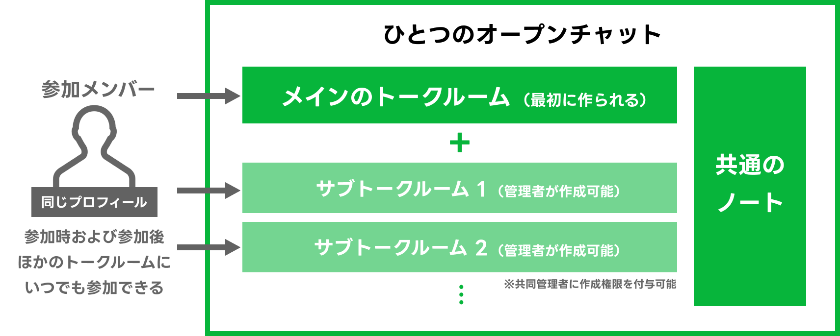 例えば、大きなジャンルのテーマでメインのオープンチャットは運用しつつ専門的な会話をサブトークルームでしてもらう方法や、最初から大きなジャンルのテーマのもと複数のサブトークルームをつくって運用する方法など、使い方はさまざまです。