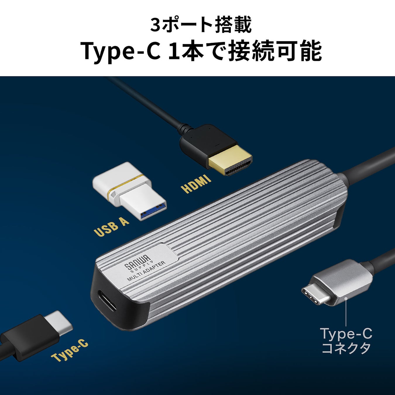 本製品は、Type-Cケーブル1本でHDMI、USB A、Type-C、microSD/SDなどの拡張接続ができるUSB Type-Cハブです。