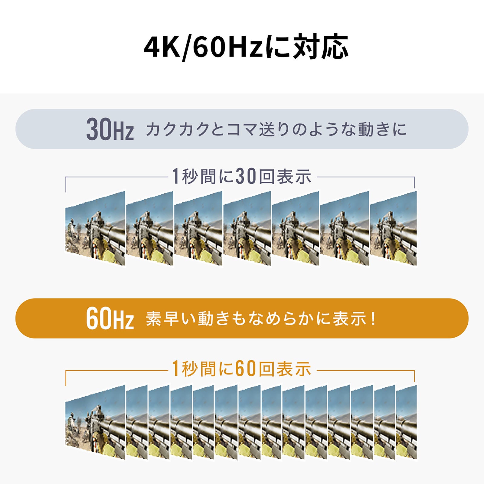 HDMI出力4K/60Hz対応で、ソフトウェアのインストールなしで簡単にマルチディスプレイ環境(ミラーモード/拡張モード)を実現できます。USB Type-Cコネクタ採用で、Type-Cポートを搭載したパソコンなどで使用できます。