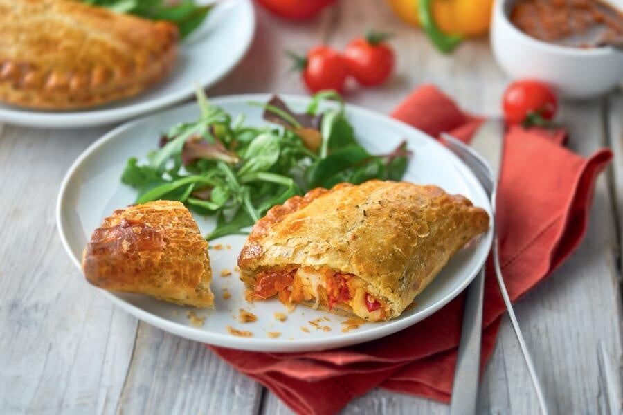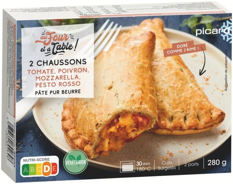 サクサクのパイ生地に、ペストロッソソースで味付けされたモッツァレラチーズとセミドライトマト、パプリカを詰めたショソン(半月型のパイ)です。