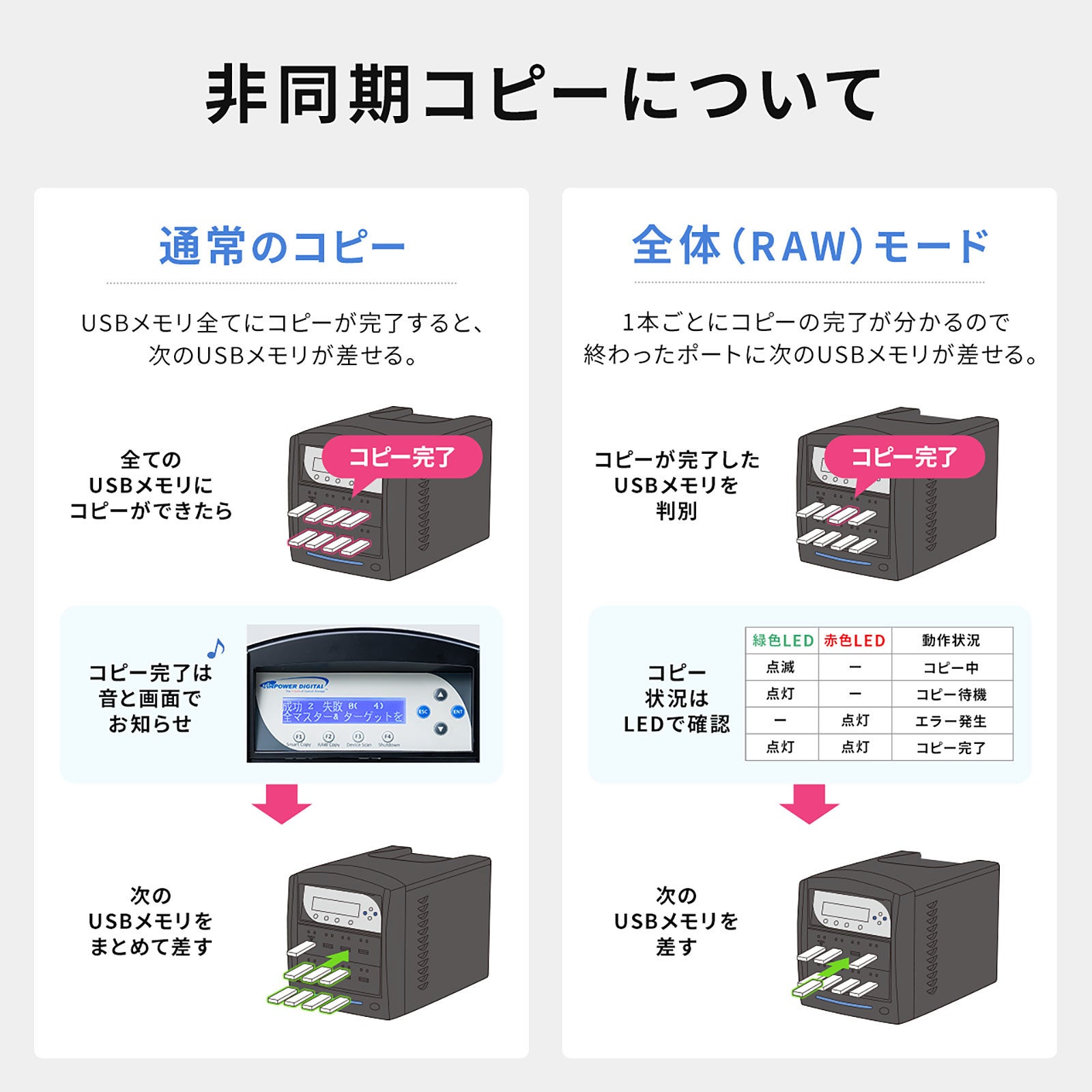 非同期モードは、コピーが終了したメディア(SDカード、USBメモリ)から次のメディア(SDカード、USBメモリ)へ差し替えてコピーを続行できる機能です。
